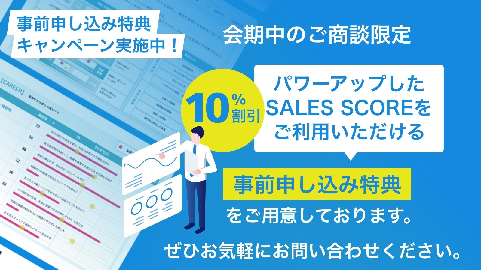 会期中に商談いただいた皆様には、パワーアップしたSALES SCOREをお得にご利用いただける先行予約特典もご用意しておりますので、ぜひお気軽にお立ち寄りください。