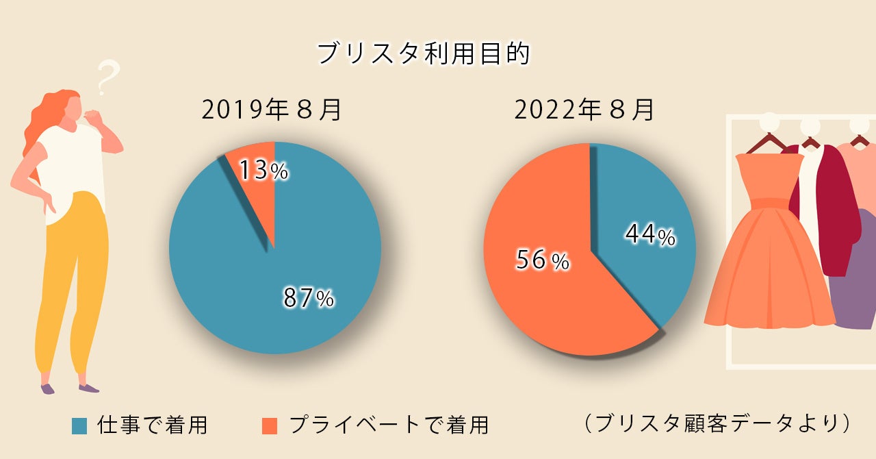 ブリスタの顧客データによると、2019年8月の新規レンタル登録者の87%が「仕事上で利用する」目的で洋服のレンタルを望んでいました。しかし、2022年8月現在では、仕事用としての利用を考える人は44%にとどまり、多くの人がプライベートの会食やパーティーのために洋服のレンタルを考えています。