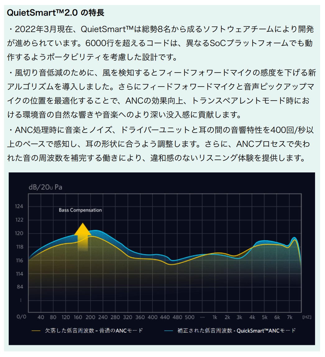 技術開発にも注力しています。ハイブリッド型アクティブノイズキャンセリング(ANC)技術の「QuietSmart™2.0」は、風切り音を低減する機能を追加したほか、独自開発のANCアルゴリズムに磨きをかけ、ドライバーユニットと耳の間の音響特性を1秒間に400回以上検出することで、没入型のサウンドと一貫したリスニング体験を実現します。