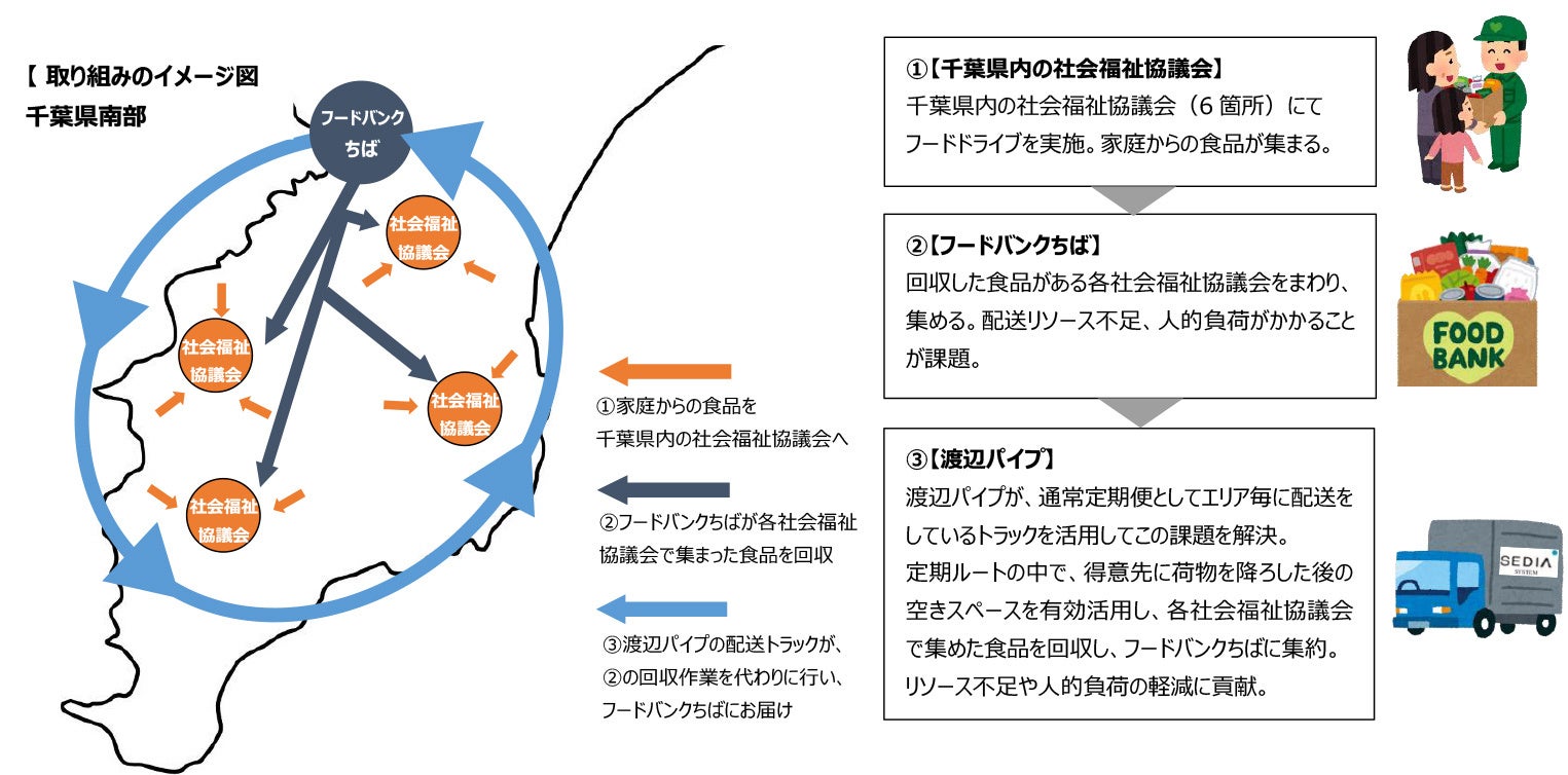 渡辺パイプが保有する配送トラックを活用し、地域や環境に貢献できないかと模索していた中で、千葉県内で、まだ賞味期限が残っているにもかかわらず、包装の破損や印字ミス、流通の都合等で大量の食品が廃棄されている現状に対して、このような食品を企業や個人から無償で引き取り、必要としている福祉施設・団体等や生活困窮者に無償で提供している、フードバンクちばの活動を知りました。