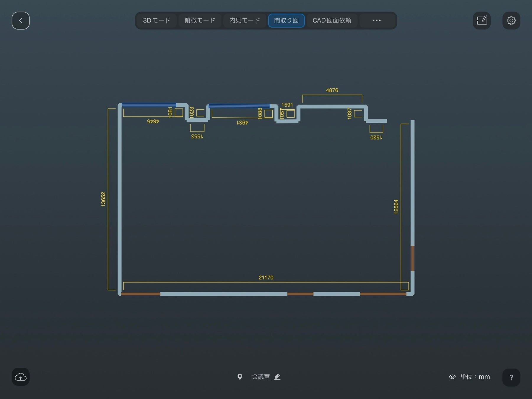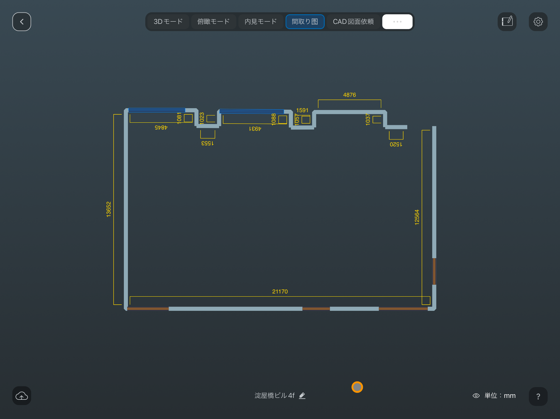 「間取りスキャン*」モードで作成した3Dモデルを間取り図面に自動で変換することができます。既存図面が無い案件において、現況図の作成に役立ちます。また、出力ボタンを押すだけで寸法入りの簡易図面(DXF形式)を瞬時に出力する機能の開発も行っております。