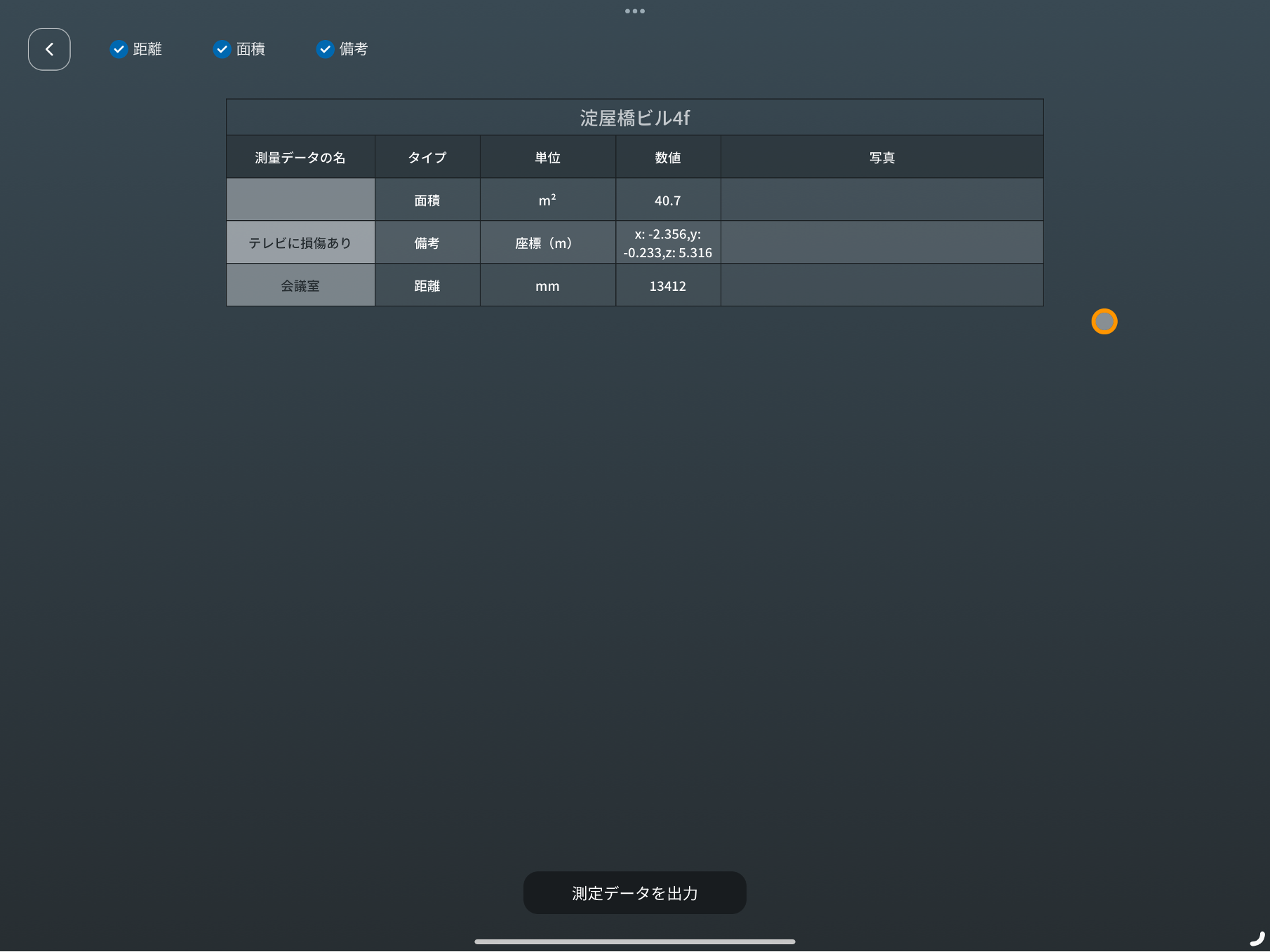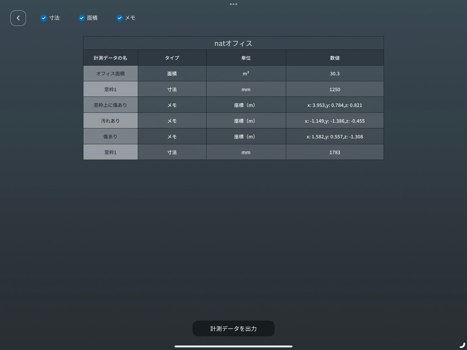 撮影した3Dモデル内で計測した寸法・面積・メモを瞬時にCSVで出力できるようになりました。見積や報告書の作成にご活用頂けるため、現場調査後の作業も素早く行うことができます。また、計測したデータは用途に応じて色分けや表示・非表示をカスタムできるようになりました。