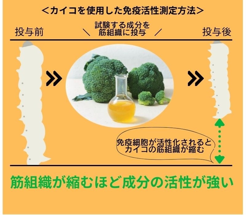 ブロッコリー多糖体は、東京大学と当社が共同で開発した「カイコ」を使う免疫活性測定技術によって発見した、世界初の新成分です。普通に調理したブロッコリーではほとんど免疫活性が起こらず、100℃を超える高熱で抽出したブロッコリー多糖体を含むエキスが高い免疫活性を示すことがわかっています。