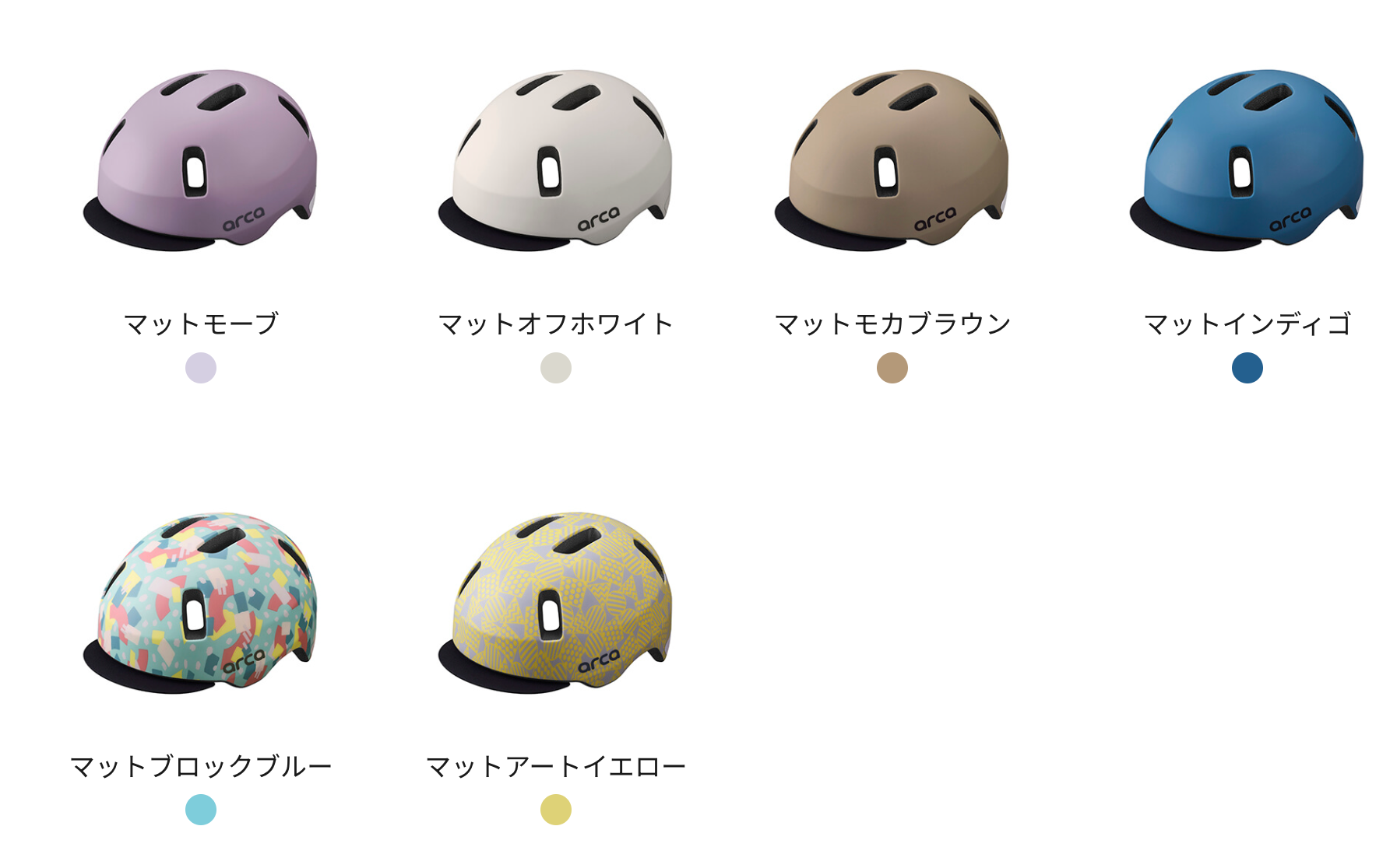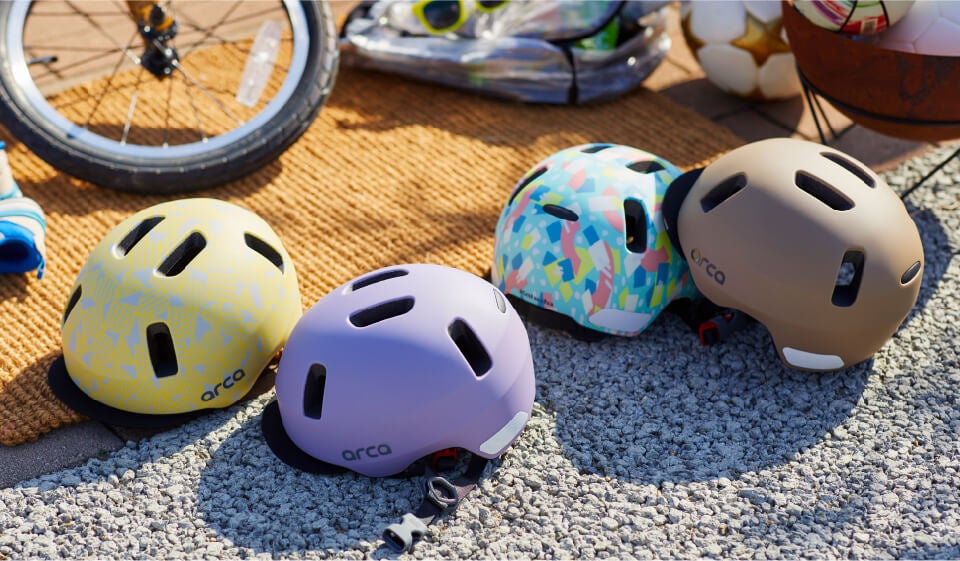 「ARCA(アルカ)」は、ファブリックバイザー付のオールラウンドヘルメット。ストリートスタイルを彷彿するデザインでPOPなグラフィックカラーと、普段のお出かけや送迎の際にも使用していただきやすいシンプルな単色カラーを採用しています。