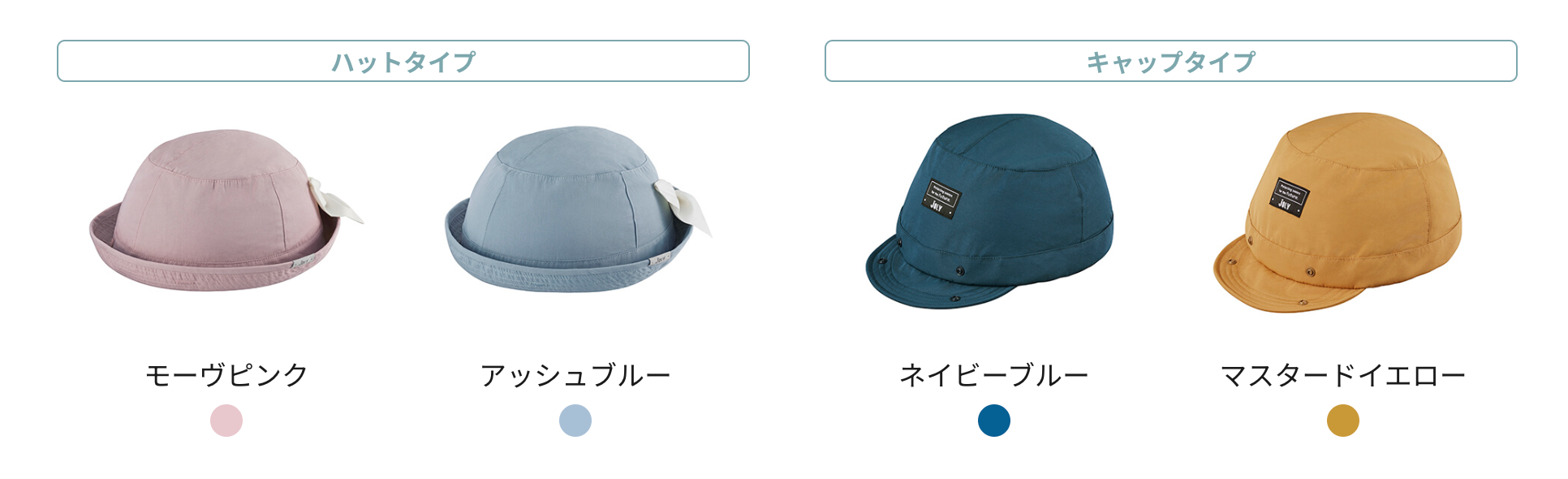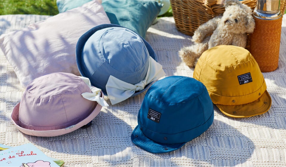 1~3歳くらいのお子様がかぶれる47-51㎝。ハットタイプはモーヴピンク/アッシュブルー、キャップタイプはネイビーブルー/マスタードイエローの全4色