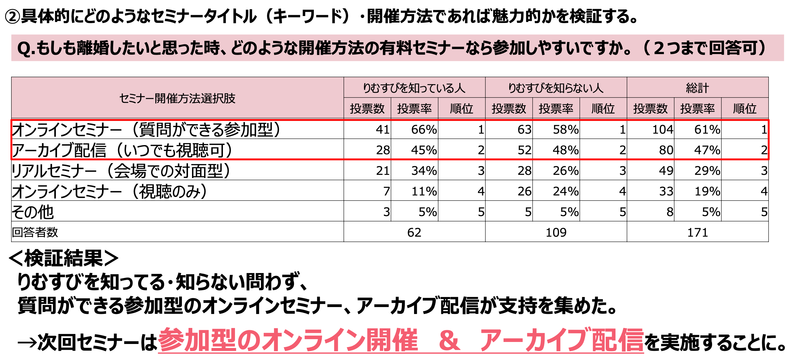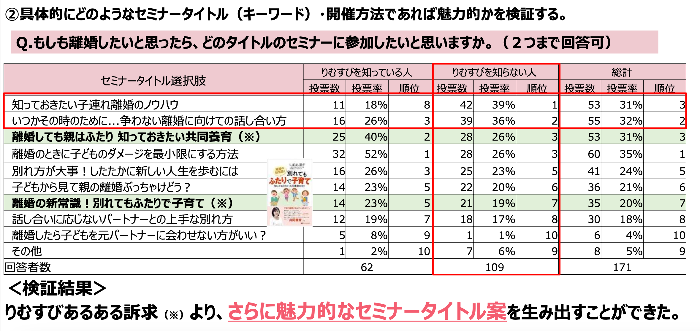 離婚に向けた方法を訴求するタイトルに票が集まりました。