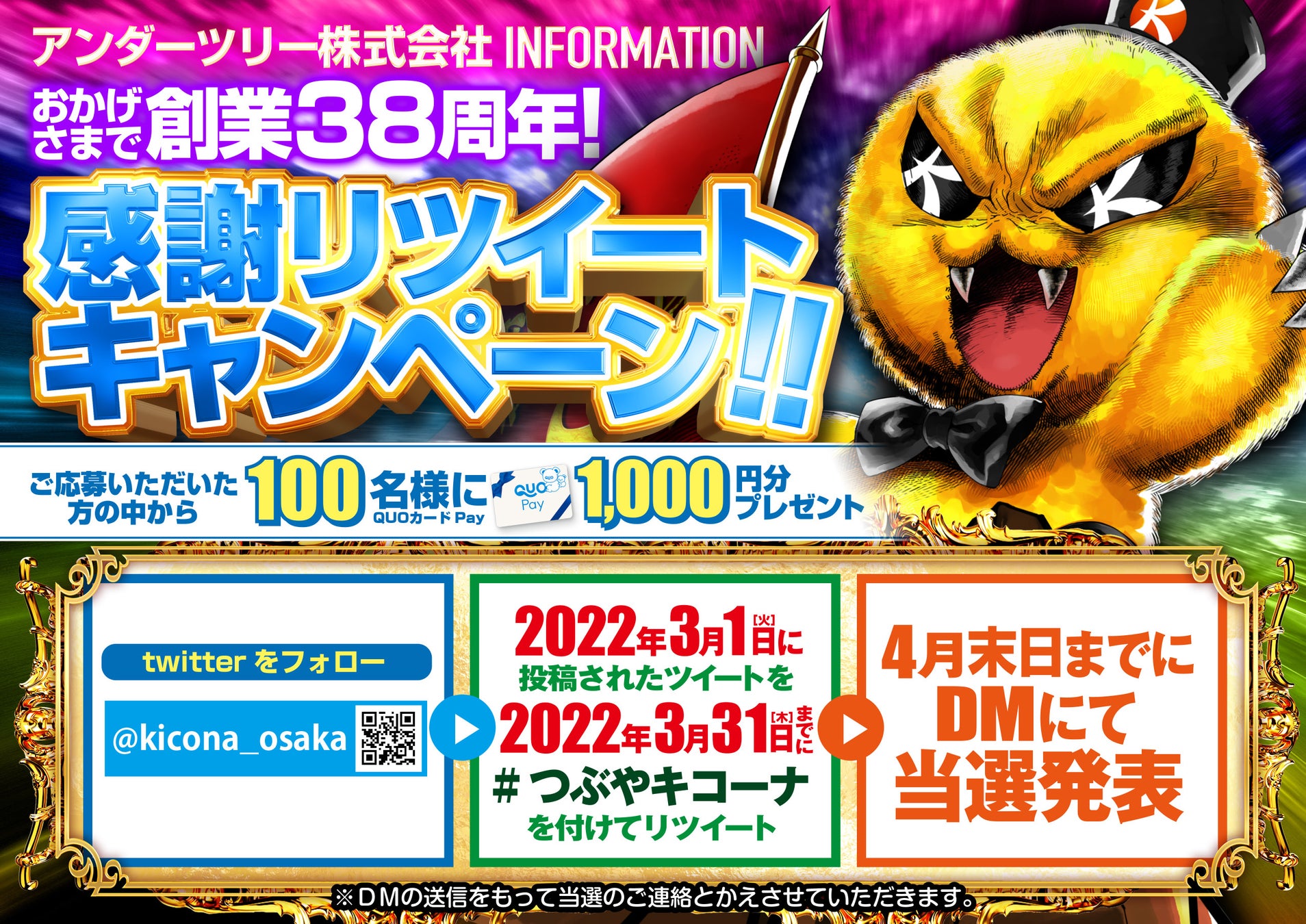 関西・関東を中心にパチンコホール(キコーナ・タウンライト・パティオ・アプリイ)を展開するアンダーツリー株式会社(本社:大阪府 代表取締役:松浦信一郎)は、1984年3月21日の創業より38周年を迎えます。