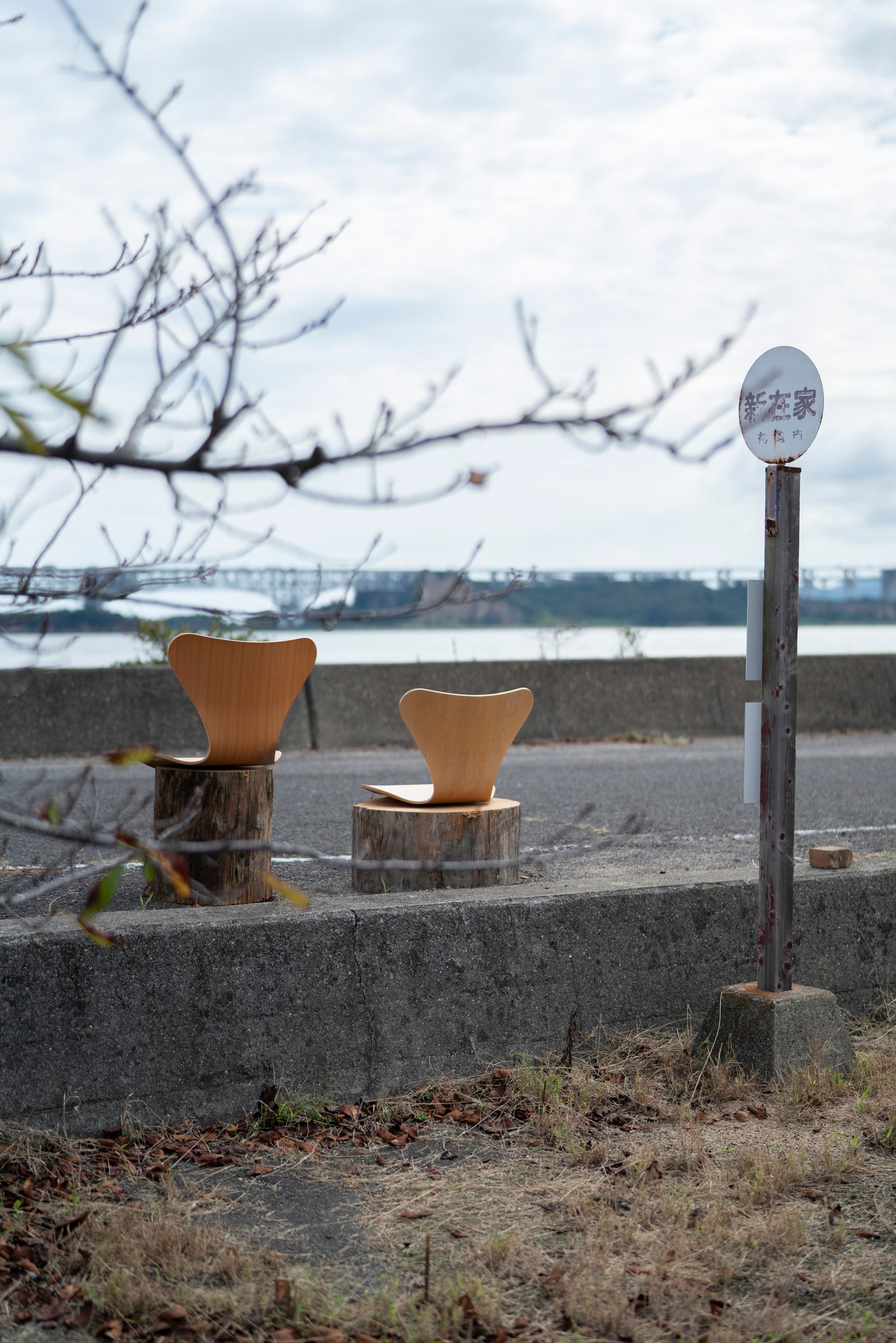 施設内ではなく、ビーチや道端、バス停などにフリッツ・ハンセンの椅子と本島の石や丸太を組み合わせたチェアを点在させ、街の人々が腰掛けて休憩できるような展示を行います。