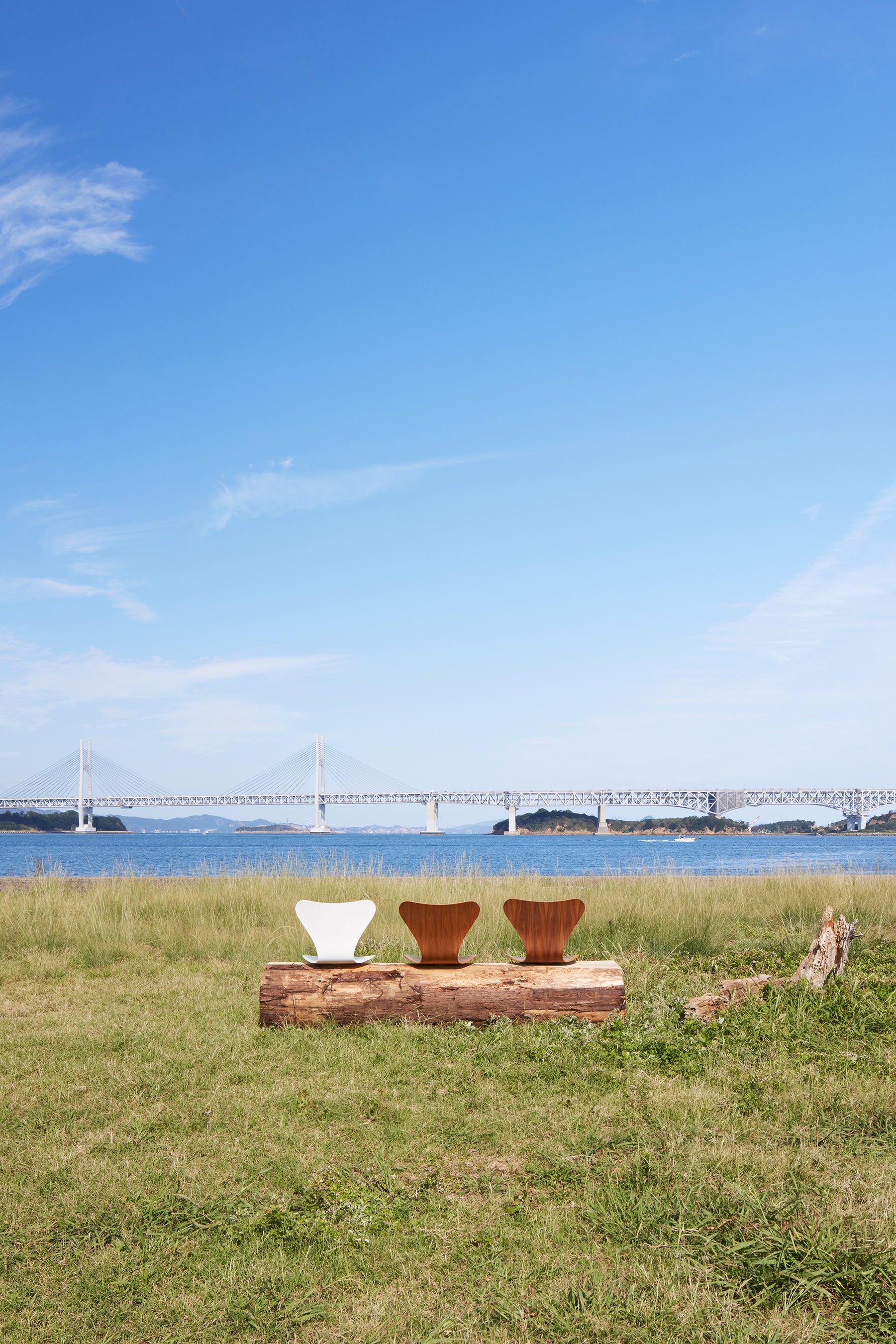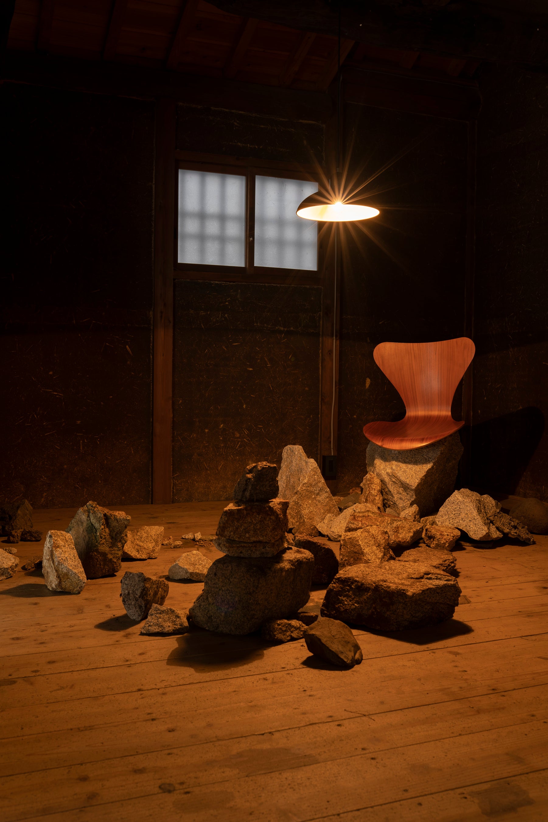 フリッツ・ハンセン庵では、家具だけでなく、本島の石とセブンチェアを合体させたインスタレーションも展示します。