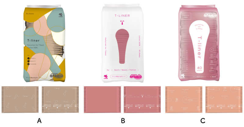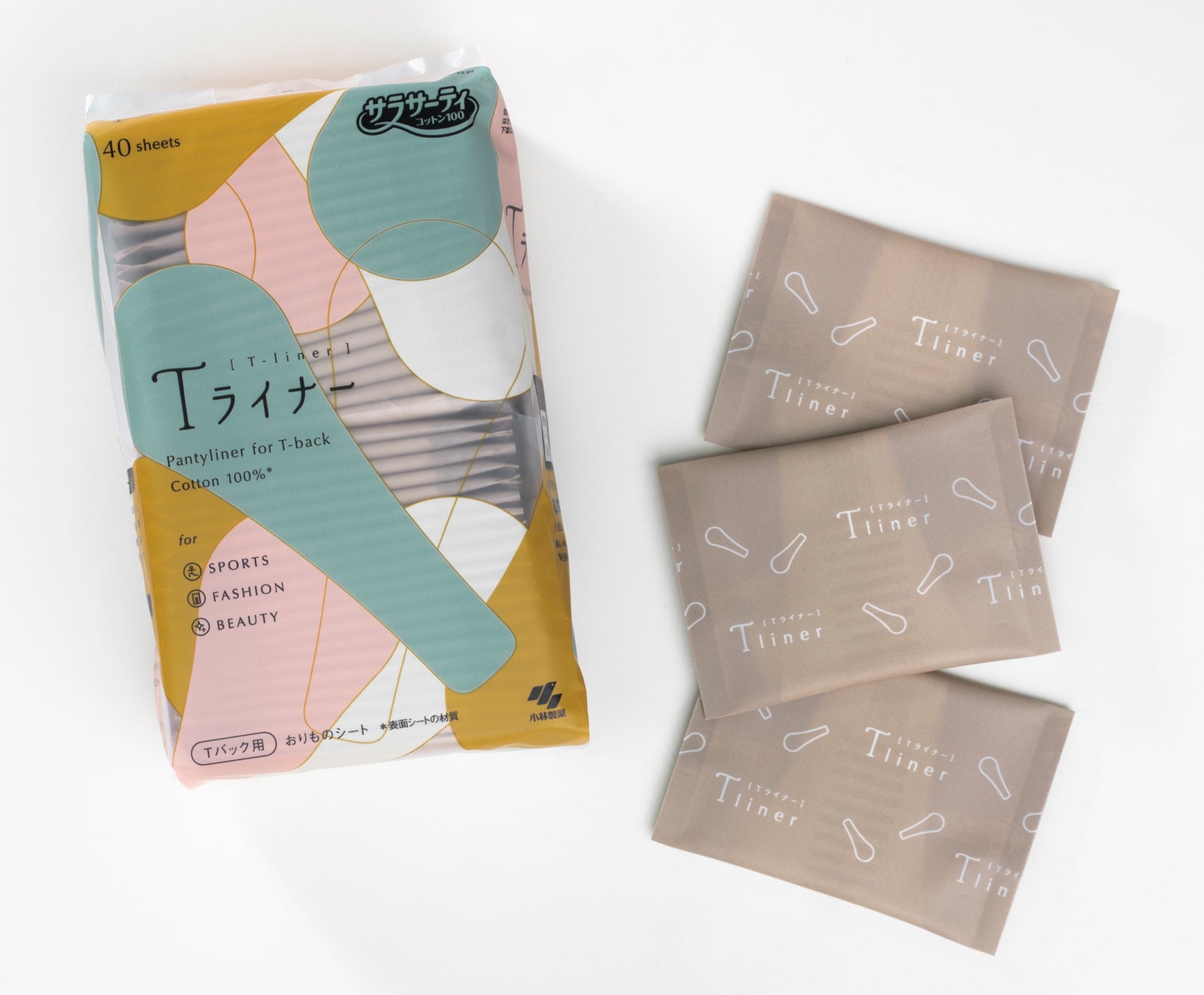 また、ドラッグストアではじめて本商品を手に取った方が「Tバック専用のおりものシート」だと認識できるようライナーのモチーフを使用しています。一方で、「Tバック用」と書かれているのは恥ずかしいという声も多かったことから、商品名を「Tライナー」に変更し、「Tバック」という文字は極力小さく配置しています。内容量も20枚入りから40枚入りへと変更しました。