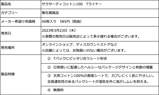 同商品は、当時、ファッションが多様化しTバック利用者が増えたことをきっかけに、Tバック着用時のおりものの不快感を軽減したいという声から生まれたTバック専用ライナーです。