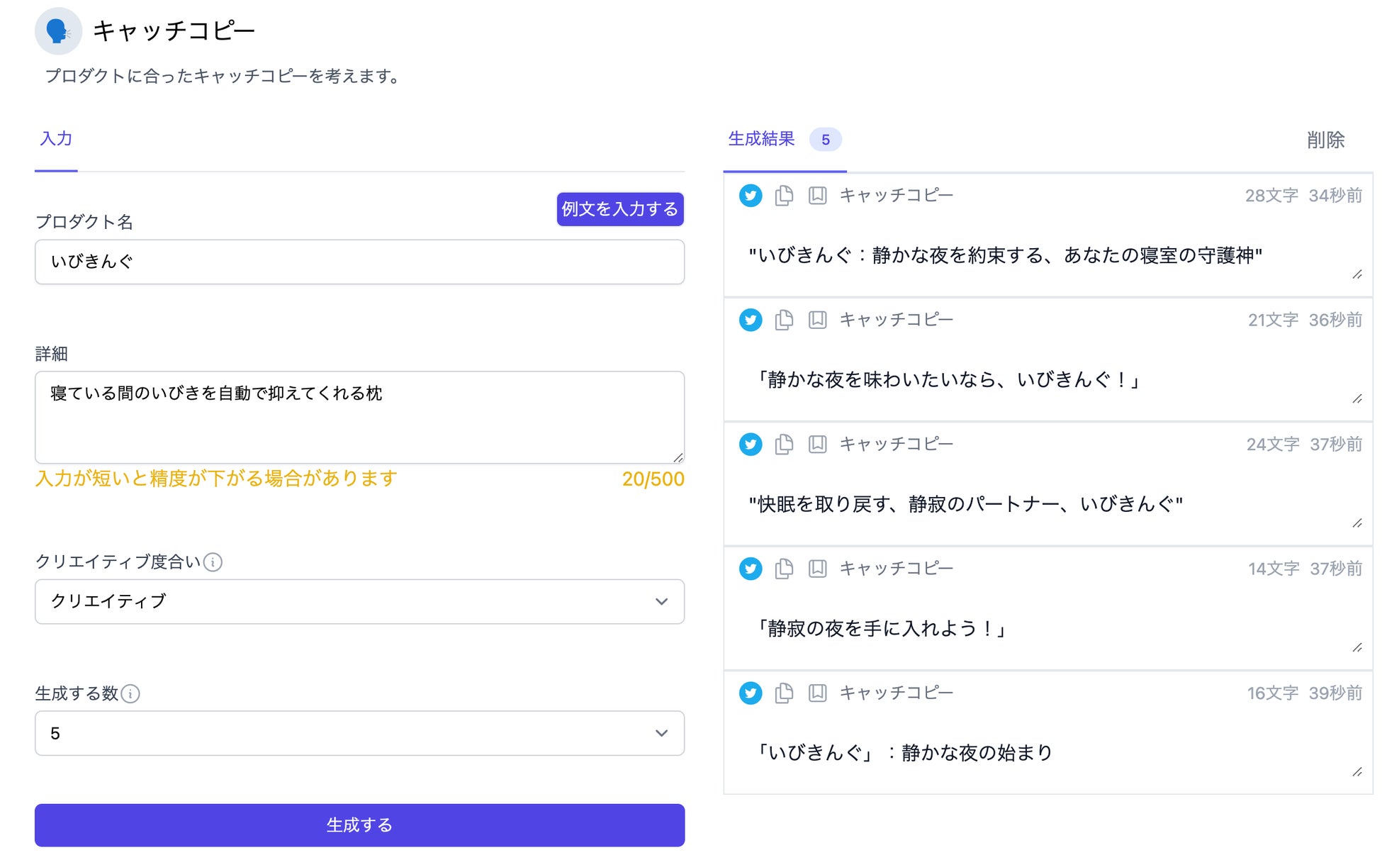 これで、貴社の商品や、サービスの魅力を引き立て、消費者の心を掴むキャッチコピーを短時間で大量に作成することが可能になりました。