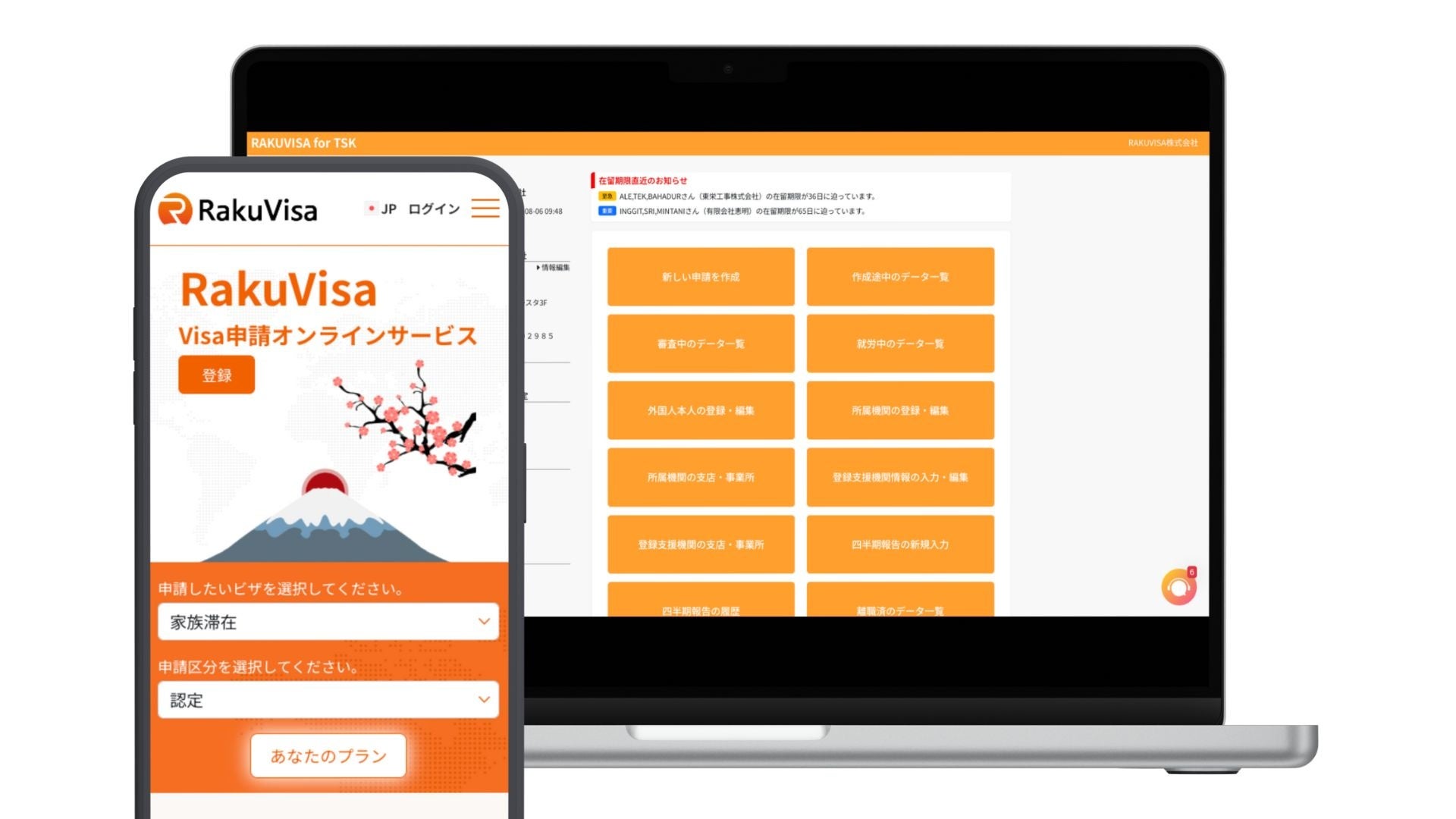 (※1)RAKUVISA for Bizは外国人を雇用する法人のための外国籍従業員の在留資格の管理及び申請支援システムであり、システムの開発と運用をRAKUVISA株式会社が行い、在留資格申請取次業務をRakuVisa行政書士事務所をはじめとするRAKUVISAに登録した行政書士等の専門士業が、申請人及び所属機関の依頼を受けて行うサービスです。