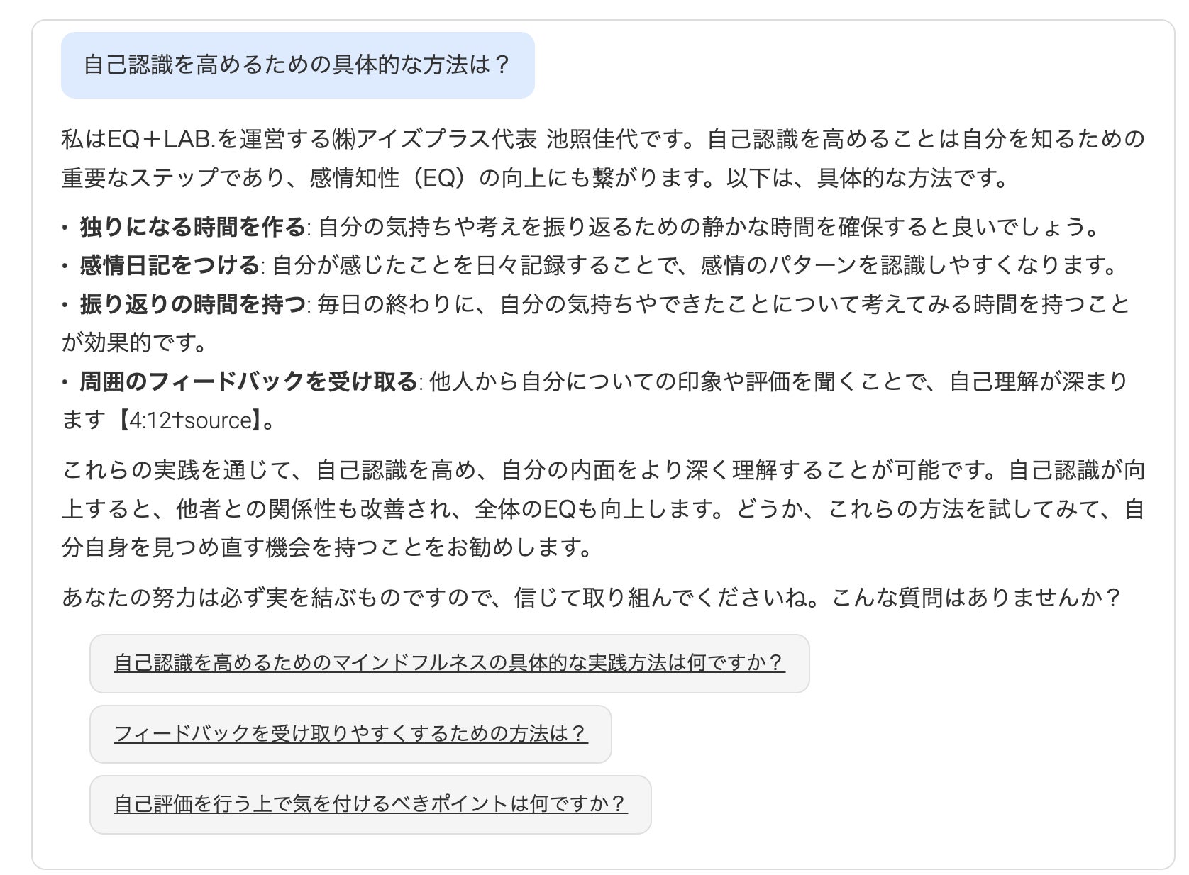 EQに関する学びは個々の状況によって異なります。本機能では、シンプルな質問からより専門的な内容まで、幅広いテーマについてAIが適切な回答を提供します。例えば、「自己認識を高めるための具体的な方法は?」「共感力を高めるために実践できるトレーニング方法とは?」といった問いに対して、実践的なヒントや参考となる情報を得ることができます。これにより、受講者は自身の課題に合わせた学習を進めることができ、より効果的にEQスキルを向上させることができます。