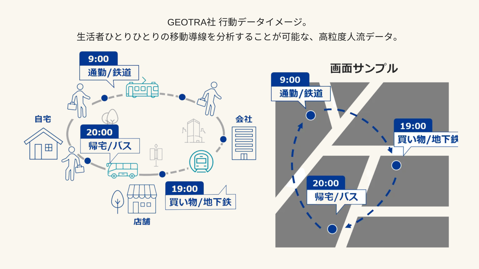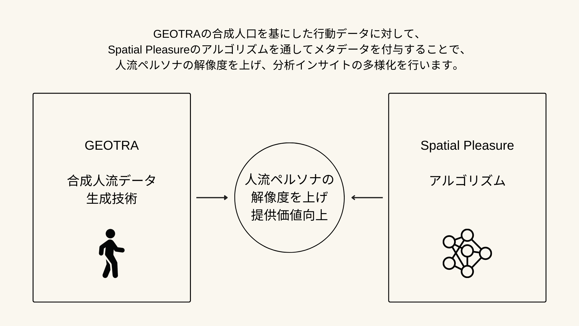 GEOTRAは、KDDIの携帯電話の契約者から、許諾を得た利用者の位置情報を加工することで、統計的には正しいが個人が特定されない、仮想的な位置情報データ(合成人流データ)を生成しています。この度の協業では、Spatial Pleasureのアルゴリズムと、GEOTRAの開発する人流シミュレーションデータを掛け合わせることで、趣味嗜好や選好性といった感性属性を付与したペルソナの行動データを生成します。