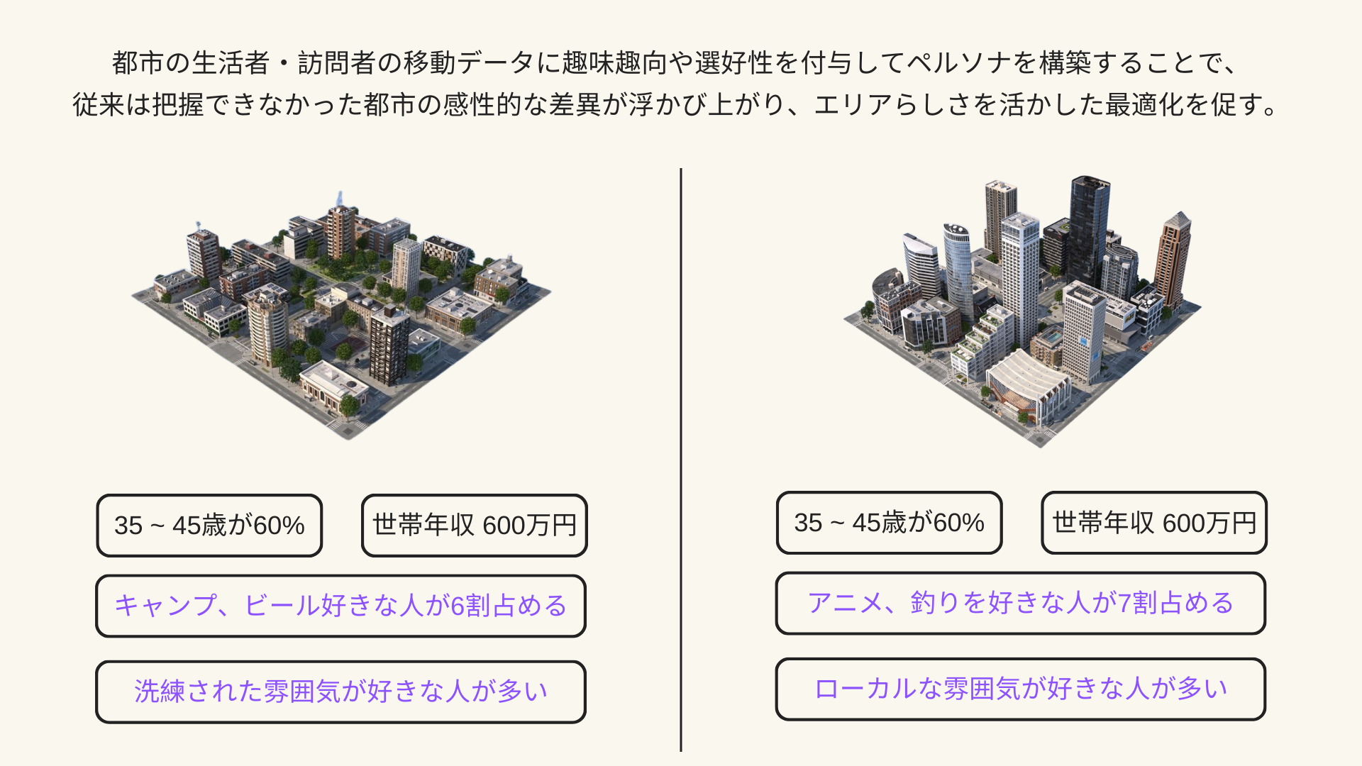 パンデミックや少子高齢化といった歴史的な転換点にあって、都市に求められる価値は大きく変容しつつあります。効果的な都市空間の再編にあたって、定量的な人流シミュレーション分析を基にした、空間形成・交通施策の検討が求められています*。従来、人流シミュレーションデータには、年齢や性別といった基礎的な属性のみが付与され、公共交通網や土木インフラ、医療福祉施設や教育文化施設の立地計画最適化などが利用用途として想定されておりました。当協業では、人流シミュレーションデータに対して、趣味嗜好や選好性といった感性的なパラメターを付与することによって、エリア内に配置する喫茶店やバーなどの店舗に係る立地最適化・キュレーションをはじめとし、各都市の独自性を活かしたエリア価値向上施策を行うための分析を行います。