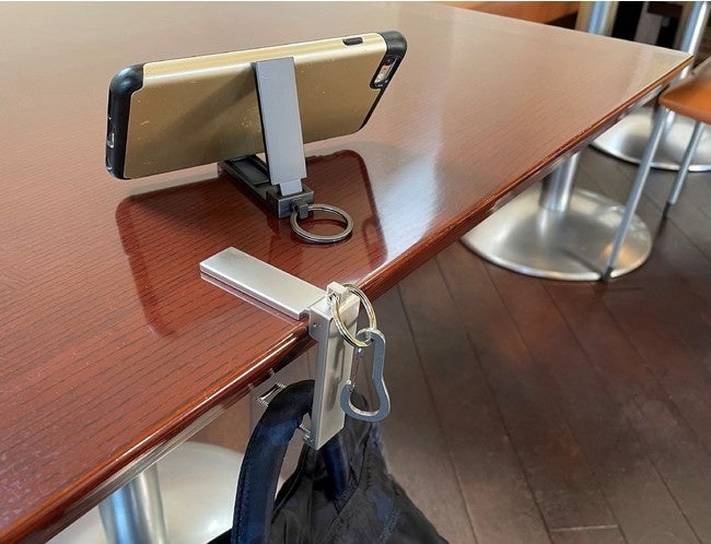 どこでも携帯できるキーホルダーがバッグや手荷物のフックハンガーとして、またスマホスタンド、タブレットスタンドとして活躍します。