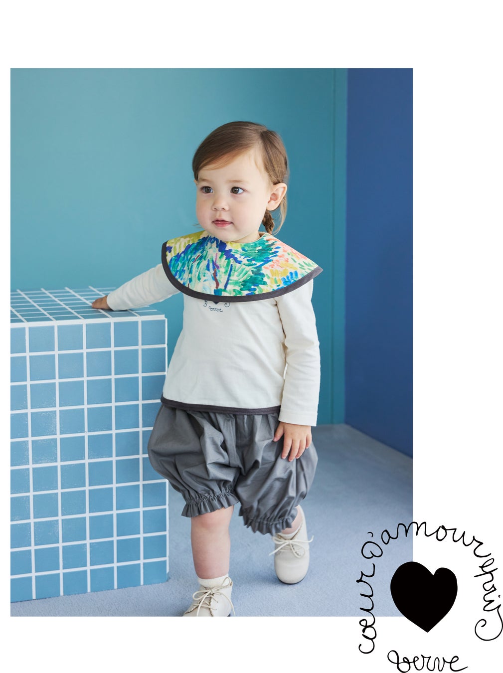 ウエスト部分はマティスの「コリウールの風景」の総プリントが入っており、ポイントになっています。ボディやロンパースに重ねたり、トップスに合わせたりと色々な組み合わせが楽しめて、小さいうちは長めのブルマとして、成長しても短めのブルマとして長くお使いいただけます。