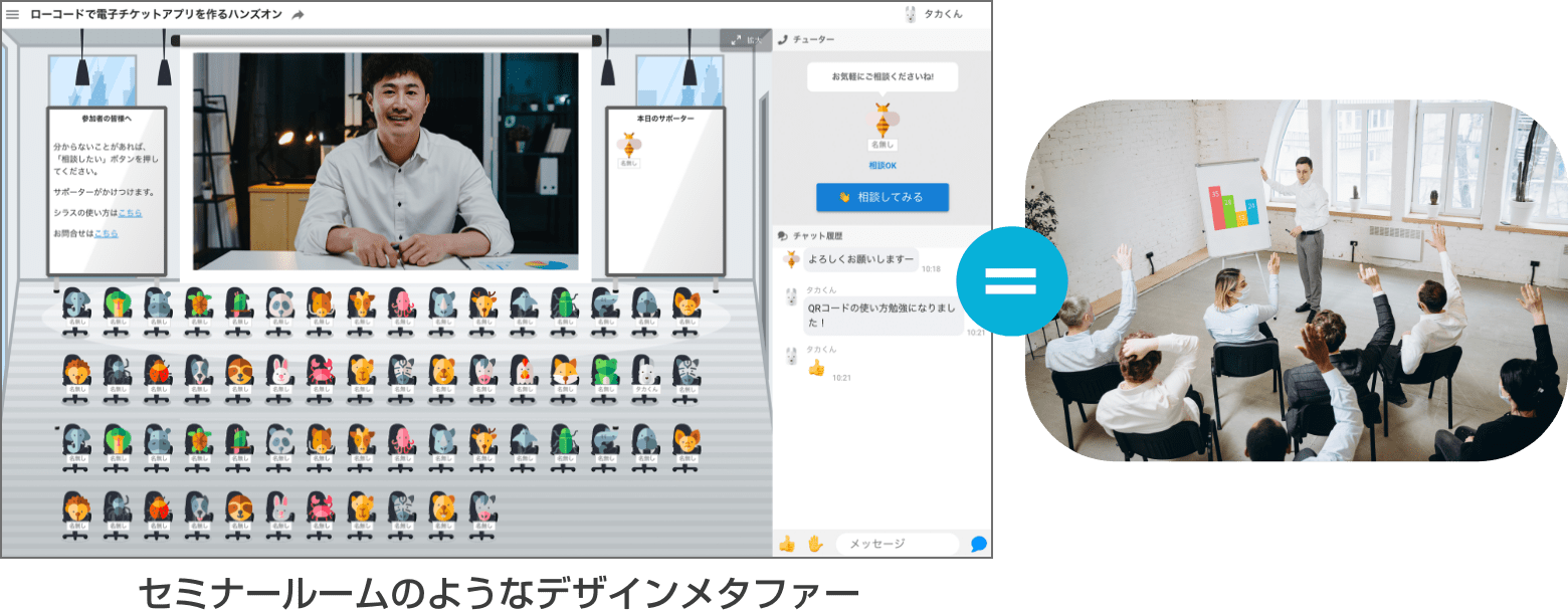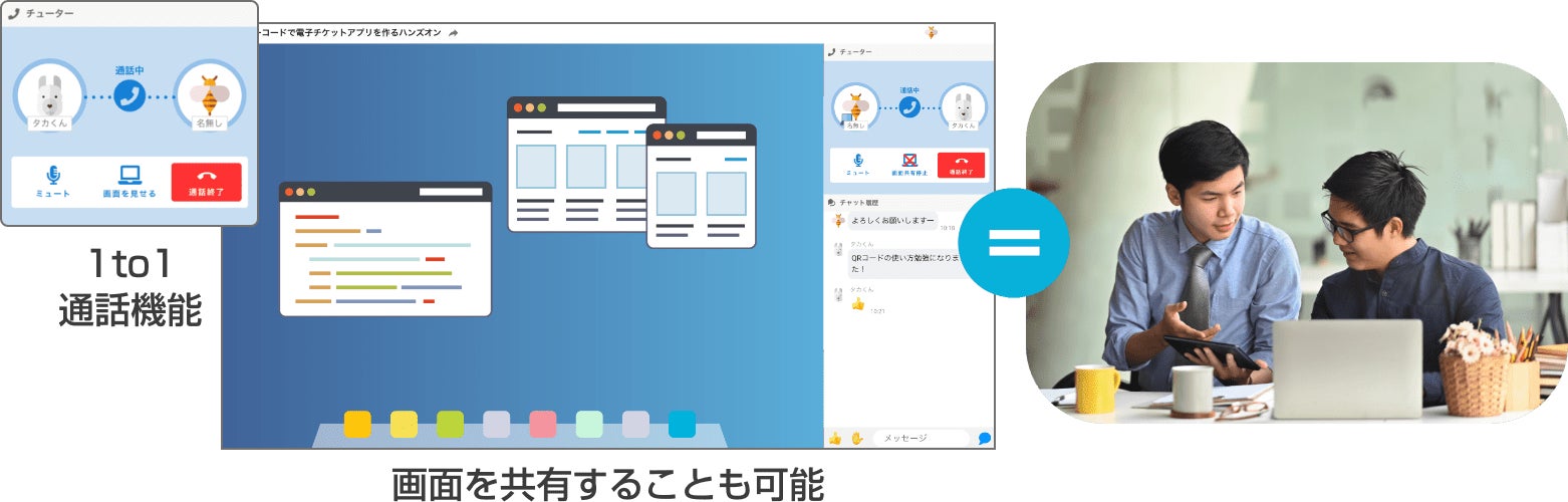 チューターによる1to1通話で参加者をサポートできるため、各種ハンズオンイベントや双方向ウェビナー、社内研修やオンライン授業など、参加者と一定のゴールを目指すイベントに最適です。