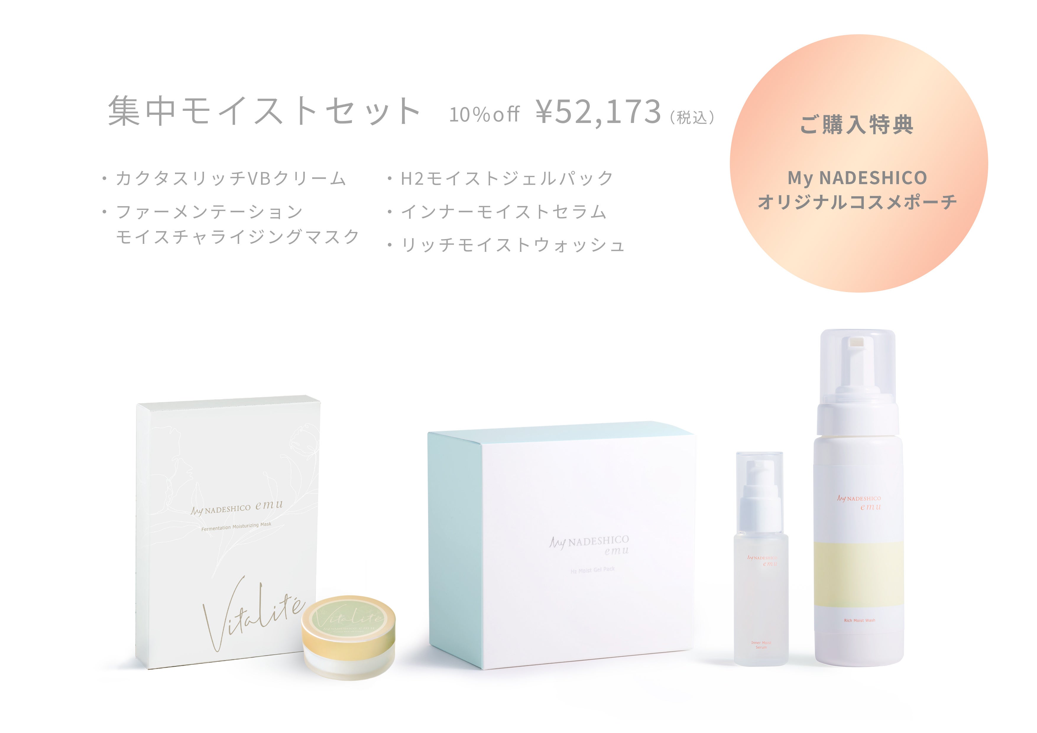 My NADESHICO emu最高峰の多機能エイジングケア*1クリーム。世界特許技術「ラメラ処方」*2 x「長時間保湿」に着目。濃厚なのに肌にスッと馴染むテクスチャーで、夜寝ている間に奥深く*3まで素早く浸透し、肌をなめらかな質感に導く夜の新習慣「ナイトエステ」としてお使いいただけます。オリジナルの発酵技術*4で低分子化したカクタス(サボテン)、次世代エイジングケア*1成分で話題の「NMN*5」を体内合成するための植物発酵エキスを配合、アンジェラックス独⾃の特許成分*6「環状ペプチド」も贅沢に配合することで、エイジングサインにダイレクトにアプローチでき、肌本来の美しさを呼び覚まし、潤いと弾むようなハリを与えます。