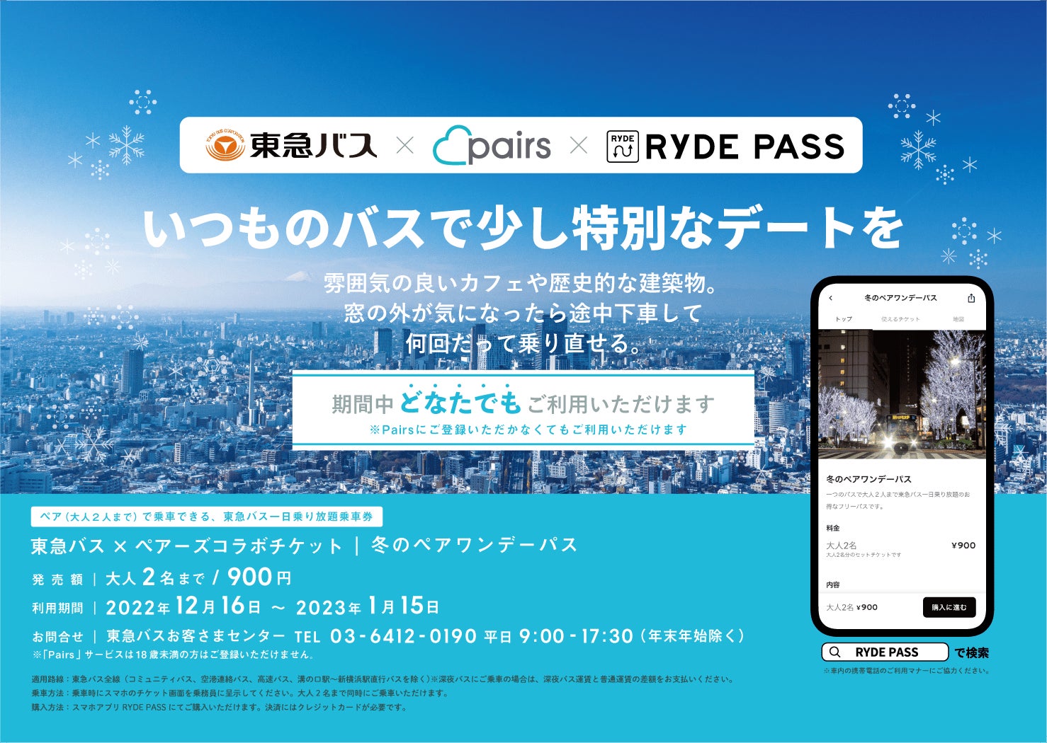 東急バス株式会社(本社:東京都目黒区社長:古川 卓)は、年末年始期のマイカー利用からの転換や新規需要の堀り起こしを目的とした新たな企画商品として、本年夏に発売した「夏休みファミリーワンデーパス」に引き続き、一つのパスで大人2名と小児2名までの計4名までが一日乗り放題となる「冬のファミリーワンデーパス」を期間限定で発売いたします。また、今回は新たにペアタイプ(一つのパスで大人2名までが一日乗り放題)として、「冬のペアワンデーパス」を同時発売いたします。こちらは 日本で最も使われている 恋活・婚活 マッチングアプリ「 Pairs(ペアーズ)」を運営する株式会社エウレカ(本社:東京都港区 代表取締役 CEO :石橋 準也)、ならびにスマホ乗車券プラットフォームを提供する RYDE 株式会社(本社:東京都渋谷区 代表取締役:杉﨑 正哉)とのコラボレーションにより、 お出かけにバスを利用する「バスデート」を提案することで、バス移動 の魅力の発見と利用促進を狙うもので、 一都三県 東京都・神奈川県・埼玉県・千葉県 在住の Pairs 会員の方はクーポン利用でさらにお得に利用することができる、業界初のコラボ企画となります。(本乗車券はPairs 会員以外 のどなたでも利用可能です) (※)MMD 研究所「 2022 年マッチングサービス・アプリの利用実態調査」 2022 年 9 月時点