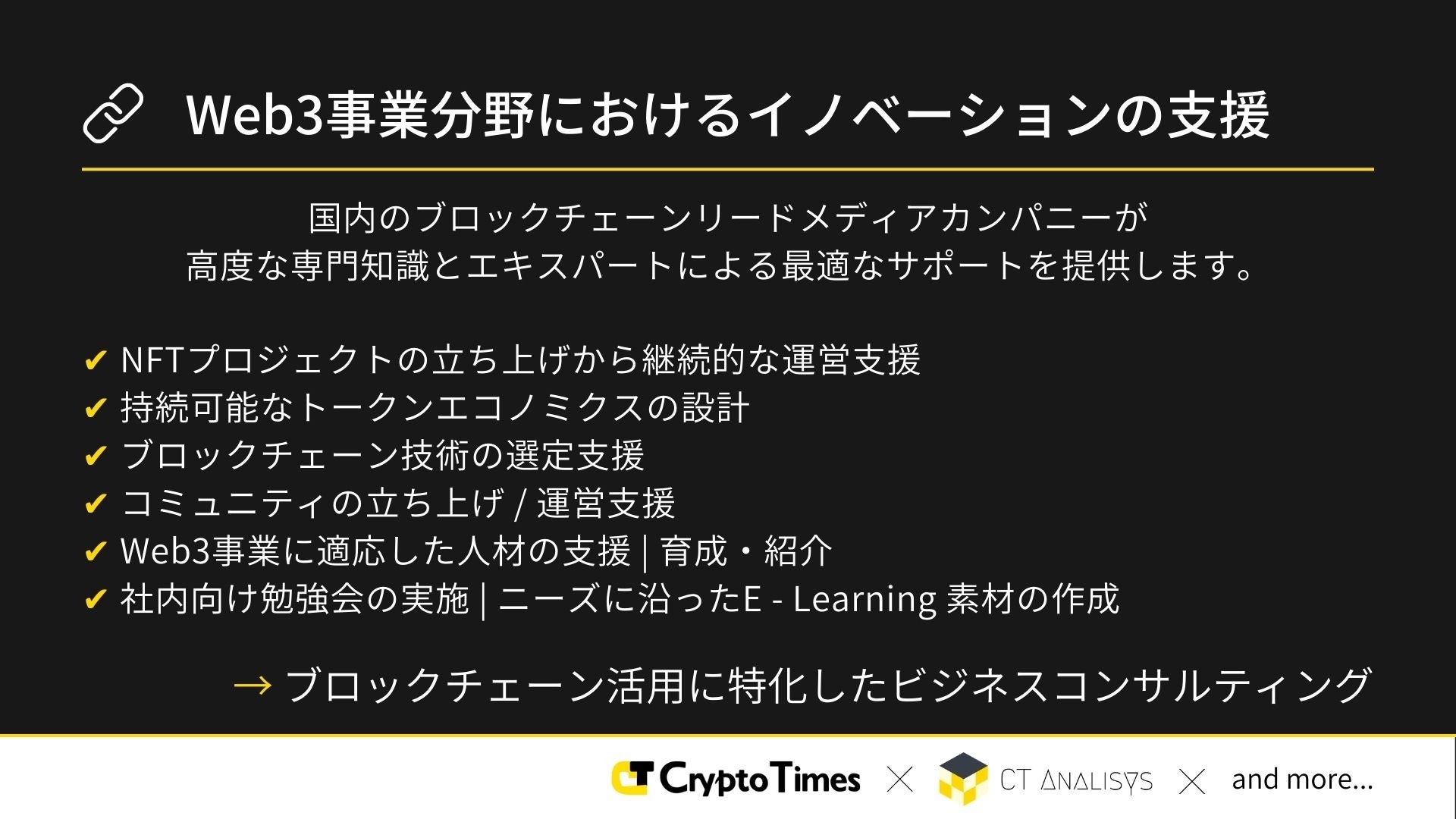 新設されたコンサルティング事業部では、弊社が運営する暗号通貨メディア『CRYPTO TIMES』とリサーチチームが提供する『CT Analysis』の経験とノウハウを活かし、ブロックチェーンの選定から、中長期に渡って持続可能なトークンエコノミクスの設計、NFTプロジェクトの立ち上げ、コミュニティ運営など、ブロックチェーン業界に精通した専門的なアドバイスと実行支援を提供いたします。