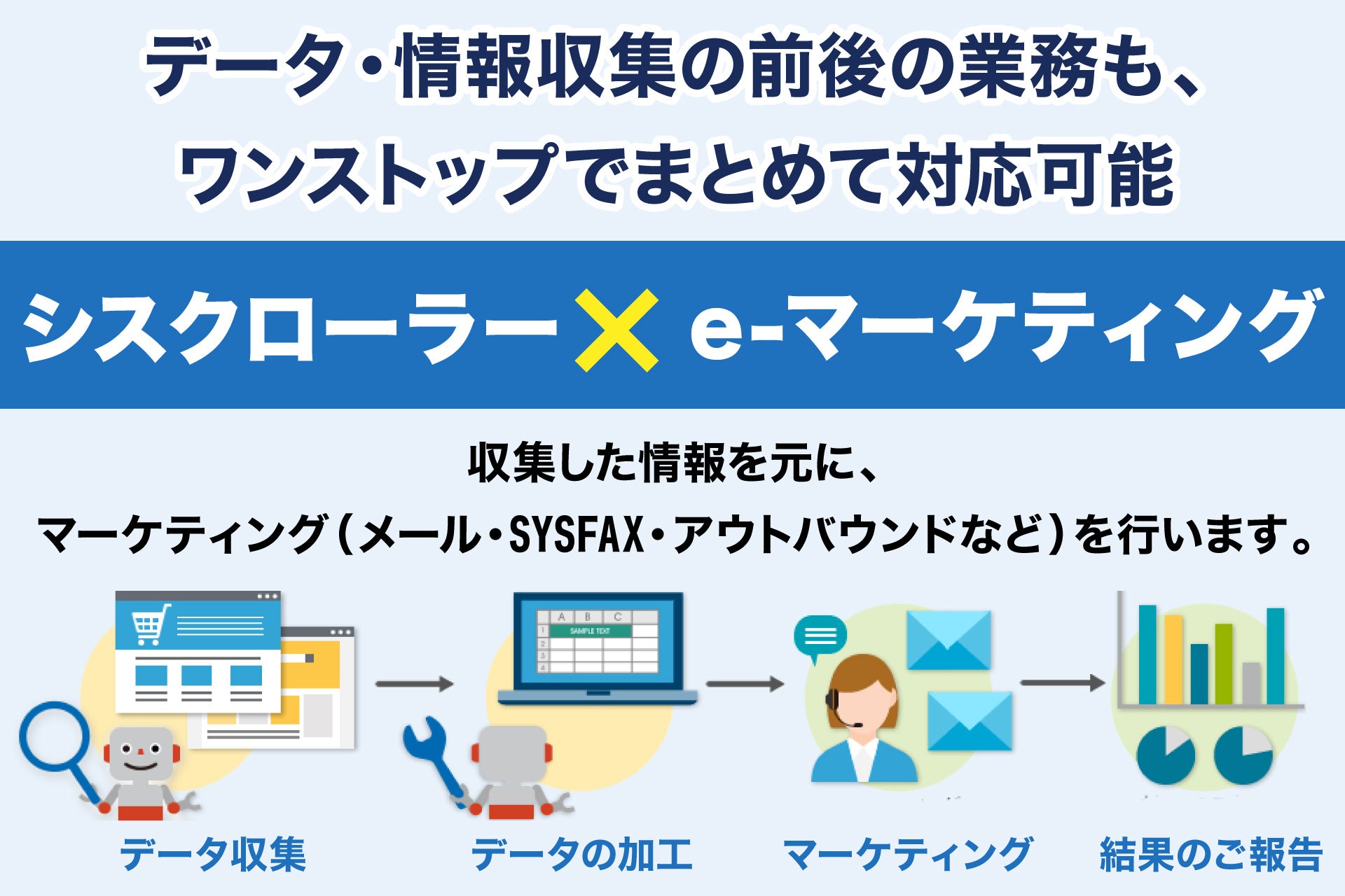 当サービスでは、収集したデータのリスト作成をスピーディーに行い、人的作業によるミスを排除します。複数のWebサイトのデータを1つのリストにまとめたり、アプリケーションをまたがった操作も可能です。さらに、関連サービスとの組み合わせにより、データ収集から販促(マーケティング)までの一連の業務に対応いたします。また、スポットでのご依頼も可能です。