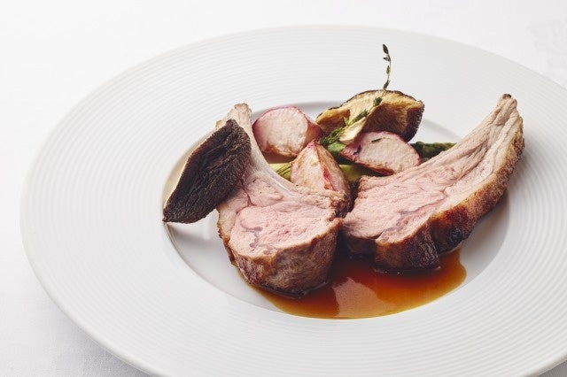 「ab restaurant」 宮崎県青島のパイナップルの芯で柔らかくマリネしたアイリッシュ グラスフェッドラムのローストとそのジュダニョー、ココナッツ風味の野菜のグリル