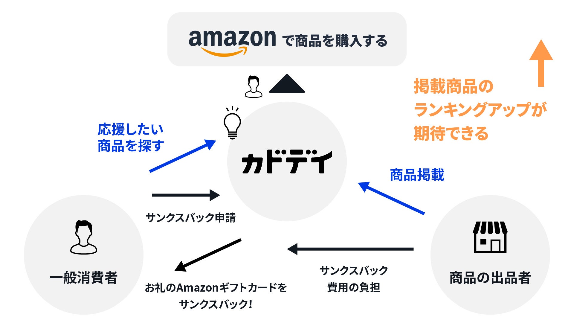Amazonで販売実績を伸ばすためには、検索上位に表示されることが重要です。しかし、検索上位に表示されるためにはAmazonにおける販売実績が必要というロジックが存在します。カドデイに掲載を行うと、サンクスバックをきっかけにお客様が商品を応援購入、Amazon上の販売実績を伸ばすとともに、検索順位向上が期待できます。また、お客様がサンクスバックされたAmazonギフトカードを用いてリピート購入をすることも期待できます。