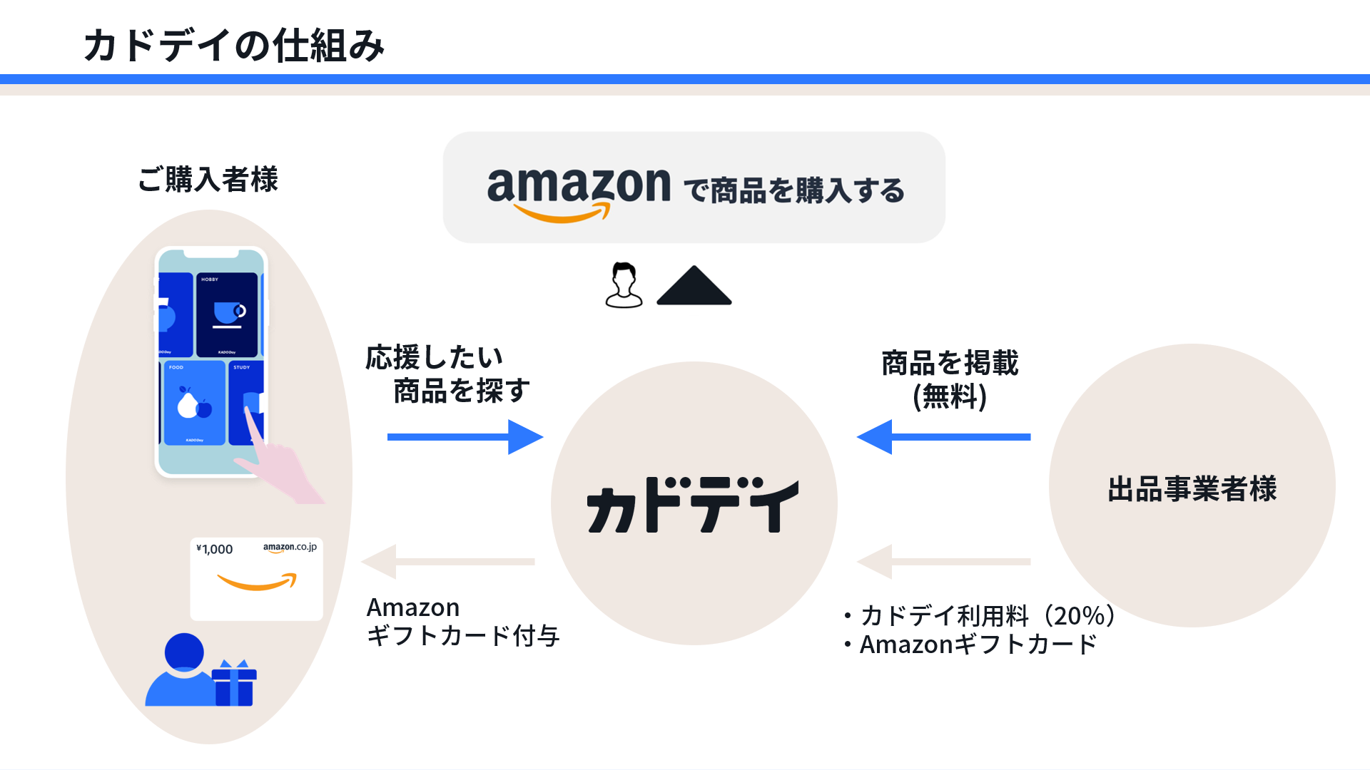 カドデイは、隠れた名品を持つ出品事業者様とお客様のWin-Winを実現するAmazon特化型応援購入ウェブサイトです。出品事業者様はAmazon.co.jpで出品している商品に対してAmazonギフトカードを用いたサンクスバックを設定することで販売促進を実現し、お客様は魅力的な商品をお得に購入することができます。