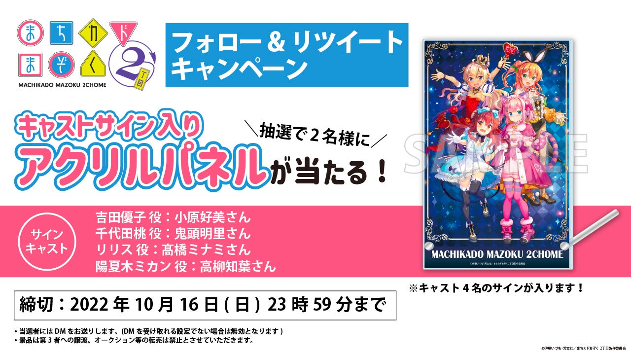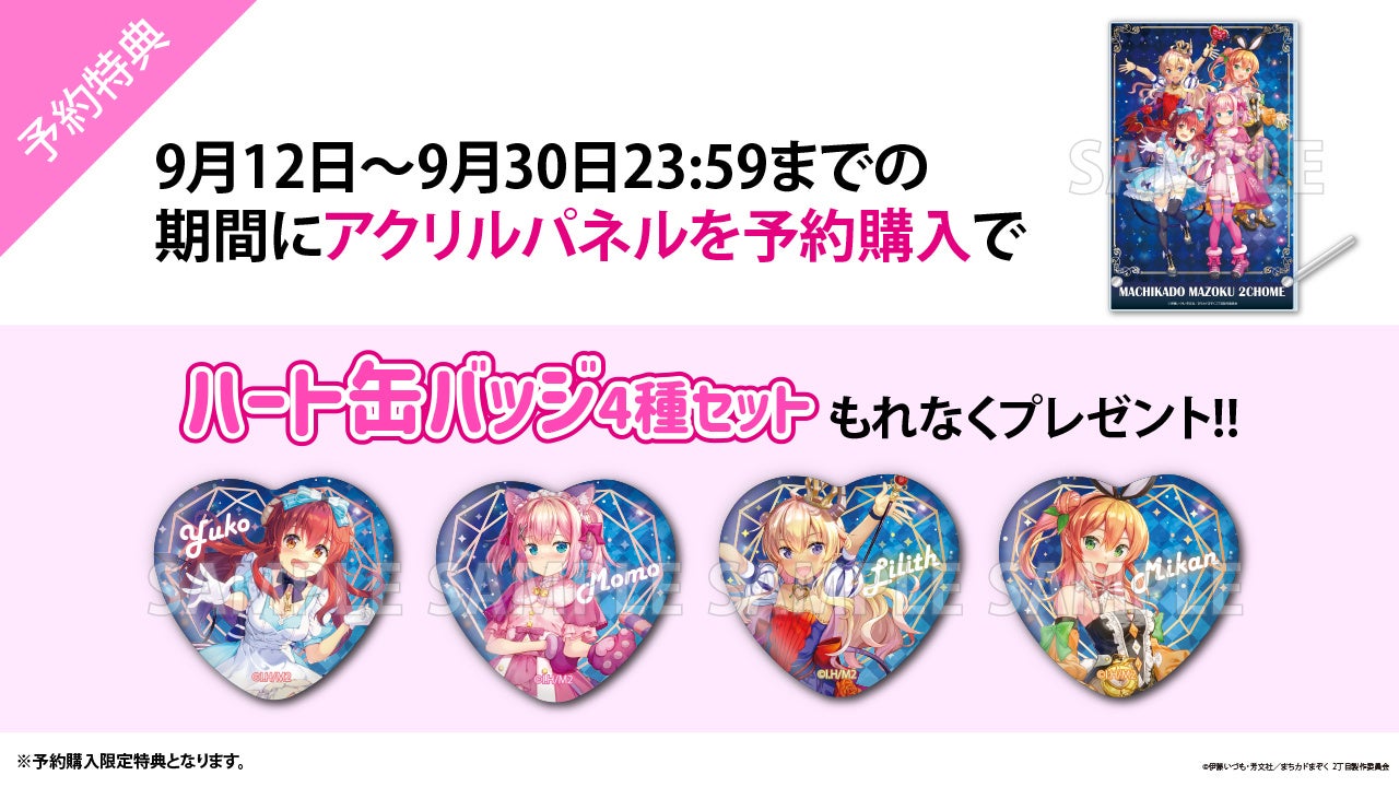 2022年9月12日(月)より、アニメ・漫画公式ライセンスグッズ通販サイト「MeeToMa」(ミートマ)において、イラストレーター藤真拓哉氏描き下ろしによる、TVアニメ『まちカドまぞく 2丁目』のアクリルパネルの予約販売を開始。さらに、9月30日(金)までに予約購入した方全員に、特典として、描き下ろしハート缶バッジ(4種1セット)をプレゼントします。