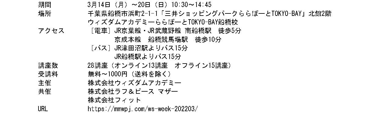 幼児から小学生の質の高いお預かりと教育サービスに特化したアフタースクールを運営する株式会社ウィズダムアカデミー(本社:東京都豊島区、代表取締役:鈴木良和)は、3月14日(月)〜20日(日)の1週間、ウィズダムアカデミーららぽーとTOKYO-BAY船橋校で新型コロナ禍における学びの場の再生に向けた体験型学習イベント「FAMILY WOKRSHOP WEEK」を開催いたします。