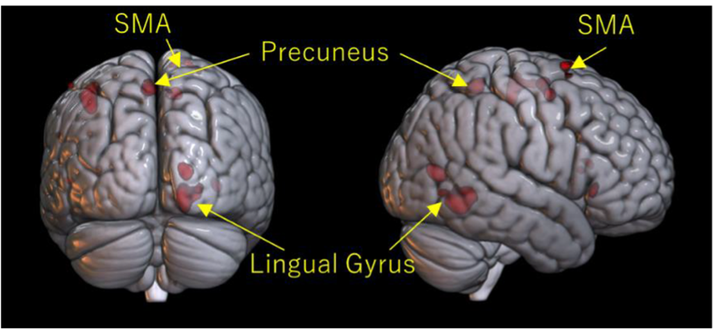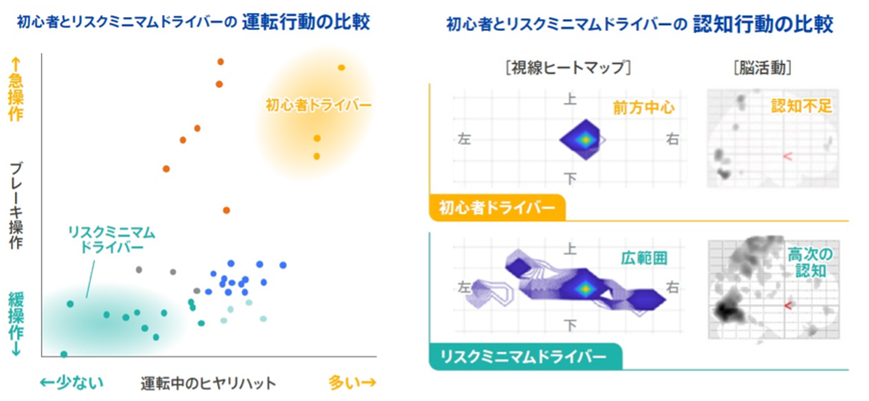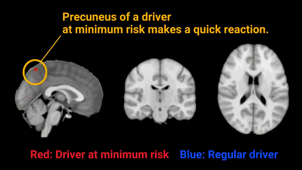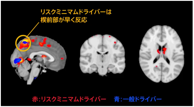 参加者にfMRI内で運転シミュレーターを操作してもらい、運転操作中の脳活動と視線を測定しました。安全運転に関してリスクの低いドライバー(リスクミニマムドライバー)と一般ドライバーのリスクに遭遇した時の脳の活動の差を抽出した際、楔前部と呼ばれる部分に顕著な活動の差があることがわかりました。運動前野、一次視覚野など他の脳部位の活動を含めた結果から、安全運転に関してリスクの高いドライバーは空間認識力が低く、危険が見えていないため予測できないことがリスク要因であること、そして経験した記憶や知識を元にリスクを判断していることが示唆されました。