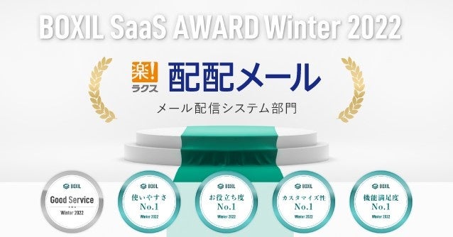株式会社ラクス(本社:東京都渋谷区、代表取締役: 中村 崇則) が提供するメールマーケティングサービス「配配メール」は、スマートキャンプ株式会社(以下「スマートキャンプ」)が今最も評価されているSaaS(※)を表彰する「BOXIL SaaS AWARD Winter 2022」のメール配信システム部門において「Good Service」に選出され、同時に「使いやすさNo.1」「お役立ち度No.1」「カスタマイズ性No.1」「機能満足度No.1」にも選ばれたことをお知らせします。