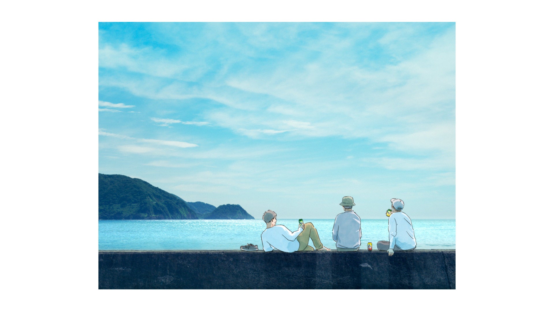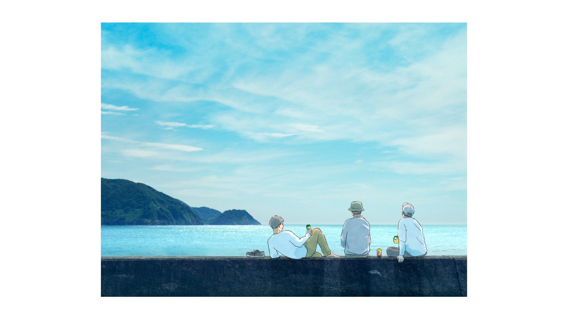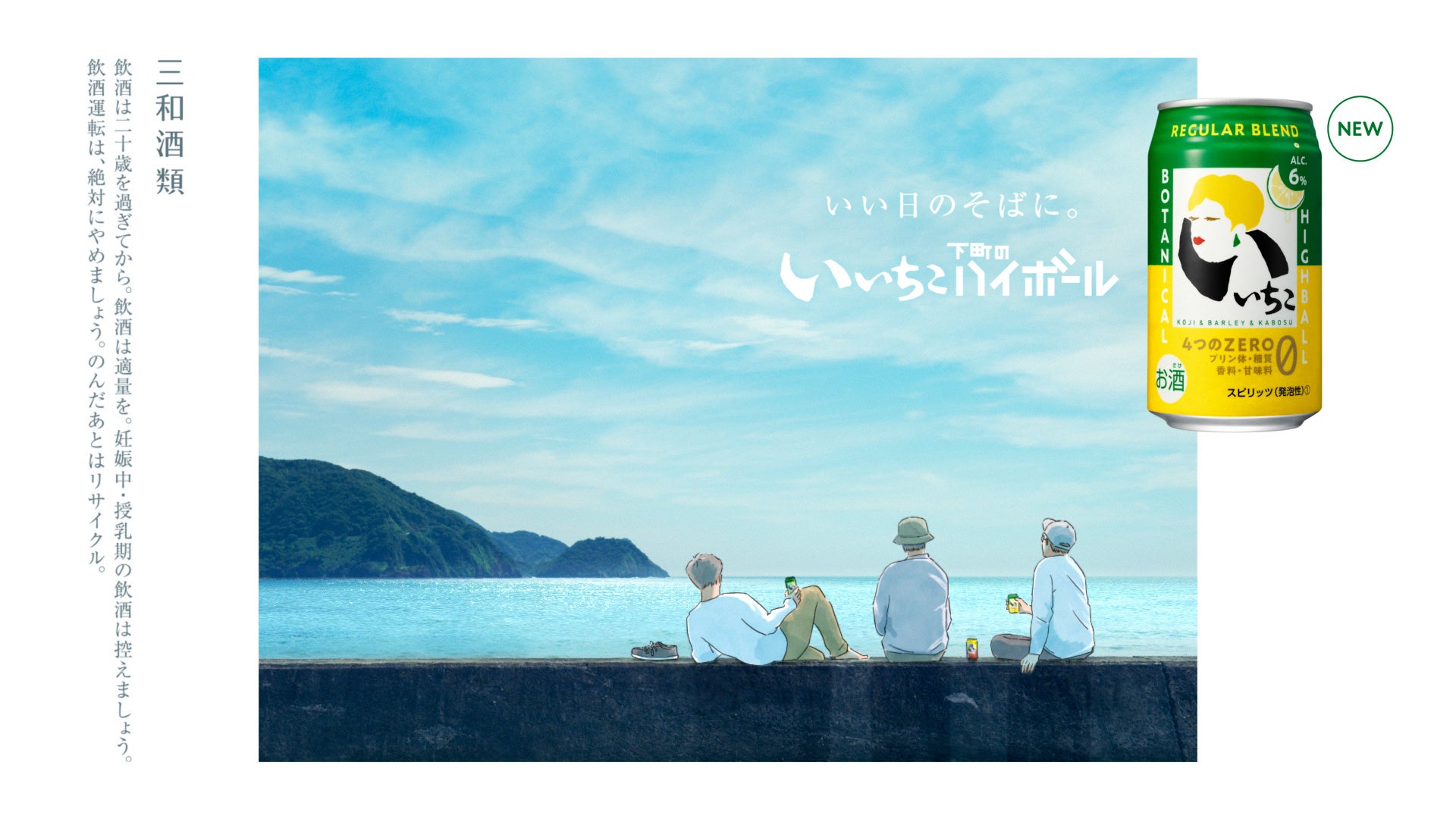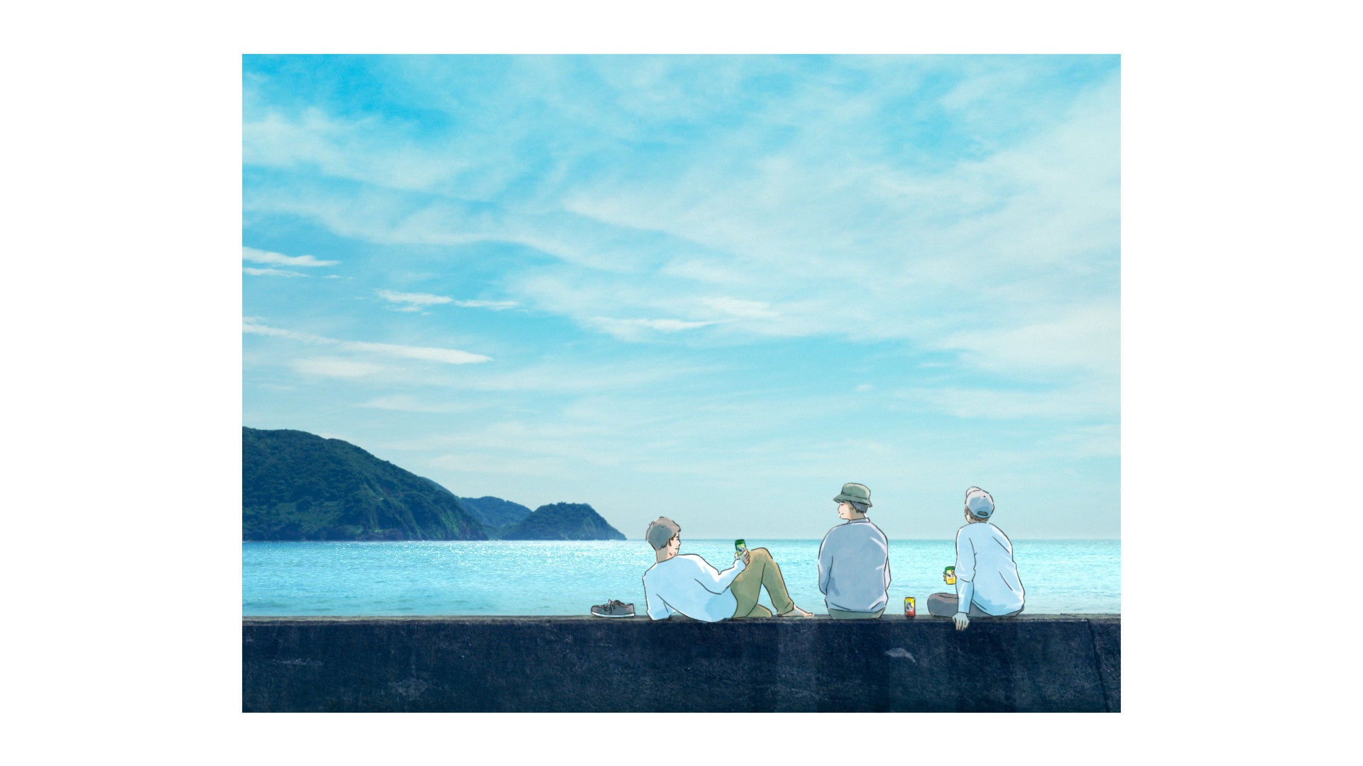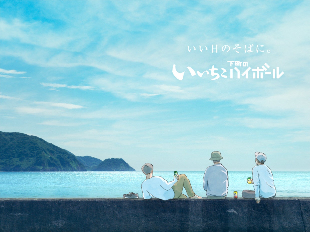 海でくつろぐ30代の男性3人。1人は実家のカフェを継いで地元で働き、他の2人は都会に出て働いています。そんな3人が、久しぶりに地元で集まったシーンを描いたCM。お互いに気を遣わず、『いいちこ下町のハイボール』を片手に何を話すでもなく、何をするでもなく、ただただ“いい時間”を過ごしています。