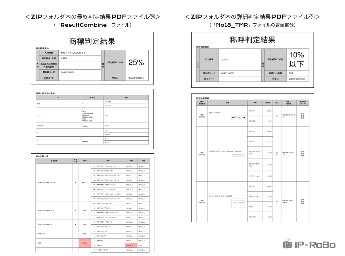 商標判定機能の最終判定画面において、「一括」欄をクリックして「結果ダウンロード」ボタンを押下すると、最終判定結果と併せて各種の詳細判定結果をそれぞれ独立のPDFファイルとして出力し、両者を有機的に関連付けた1つのZIPフォルダとしてダウンロードされます。