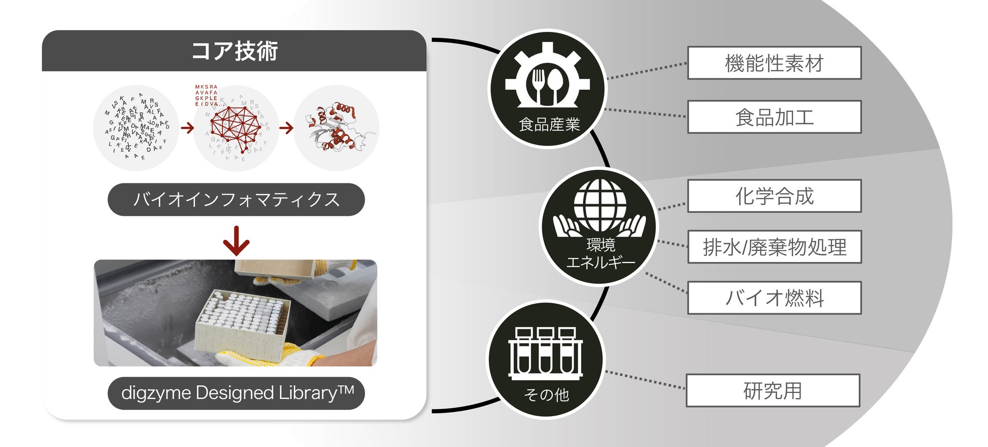 本シリーズでの開発では、特に産業用酵素を出口とした、高機能な酵素のライブラリ(“digzyme Designed Library”)の製造を目的とします。産業用酵素の用途は、食品・化学・洗濯用洗剤・繊維・バイオマスエネルギー・飼料・農業・体外診断・研究など多岐にわたります。