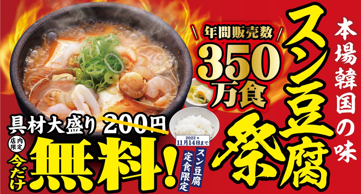 株式会社やる気(所在地:京都市伏見区北端町70番地、代表取締役 大島聖貴)が展開する、カルビ丼とスン豆腐専門店「韓丼」は、 2022年11月1日(火)から14日(月)まで期間限定で、スン豆腐定食(店内限定)の具材大盛り無料キャンペーンを実施いたします。