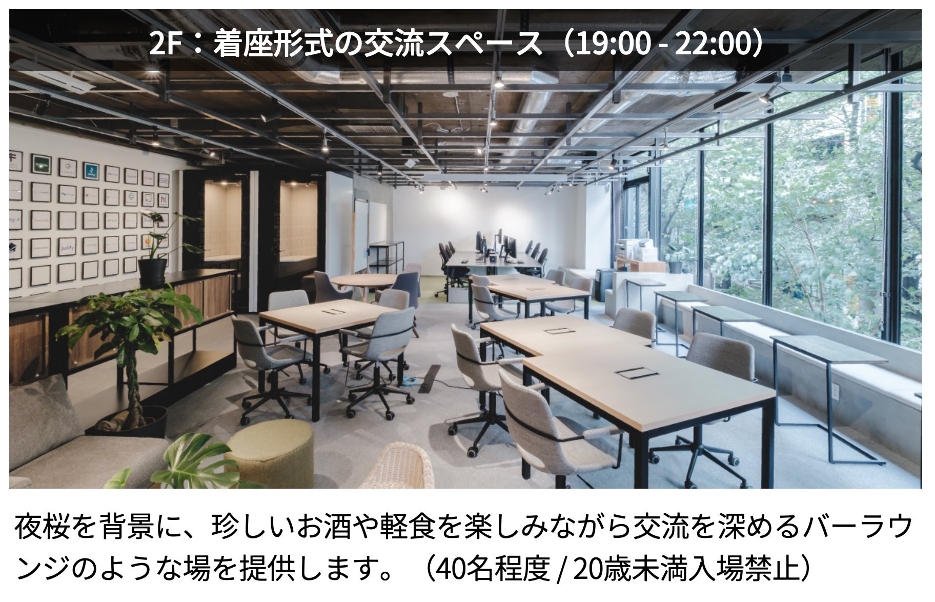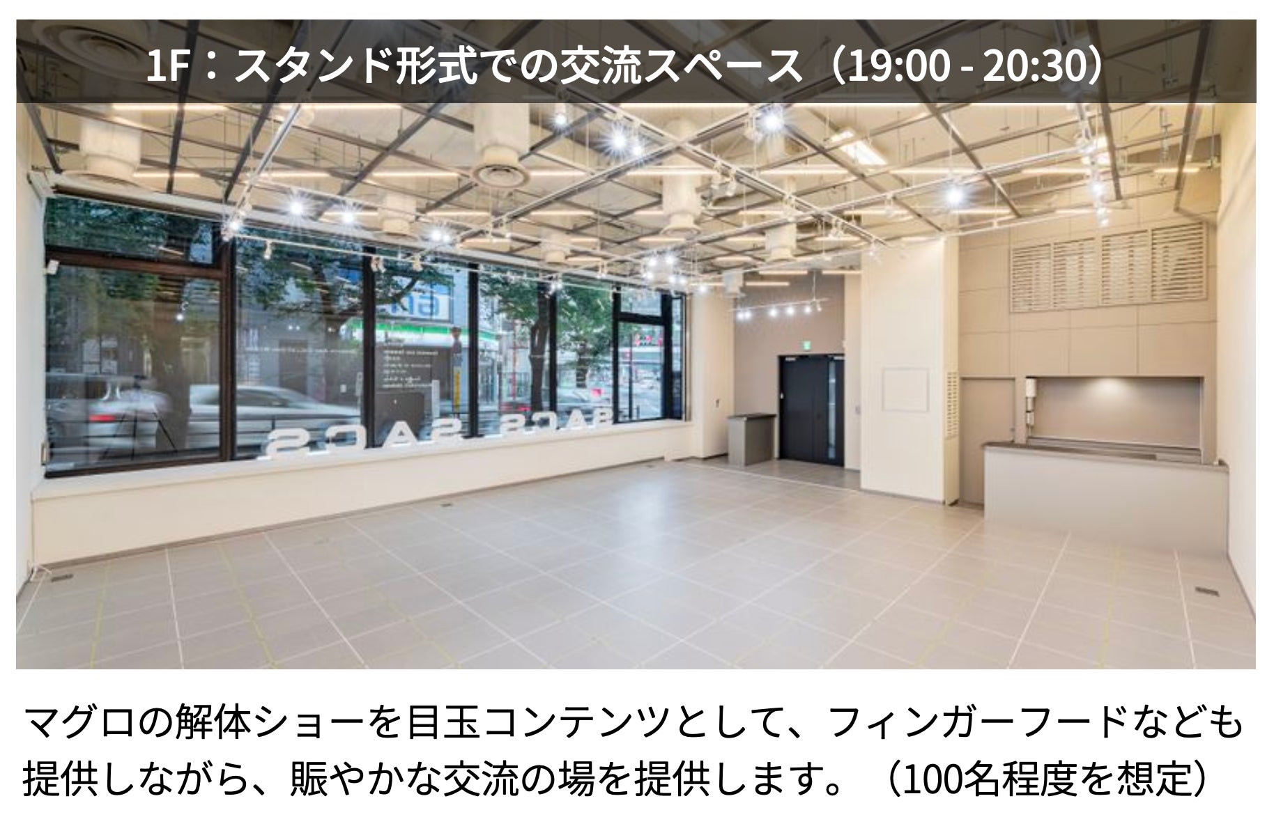 交流会ではマグロ解体ショーを目玉として、1Fではカジュアルな交流スペースに、2Fは夜桜を楽しみながら様々なドリンクを楽しめるバースペースとして提供します。