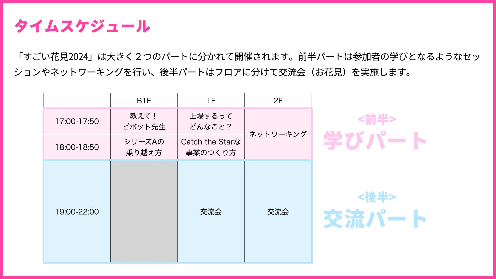 「すごい花見2024」は大きく2つのパートに分かれて開催されます。前半パートは参加者の学びとなるようなセッションやネットワーキングを行い、後半パートはフロアに分けて交流会(お花見)を実施します