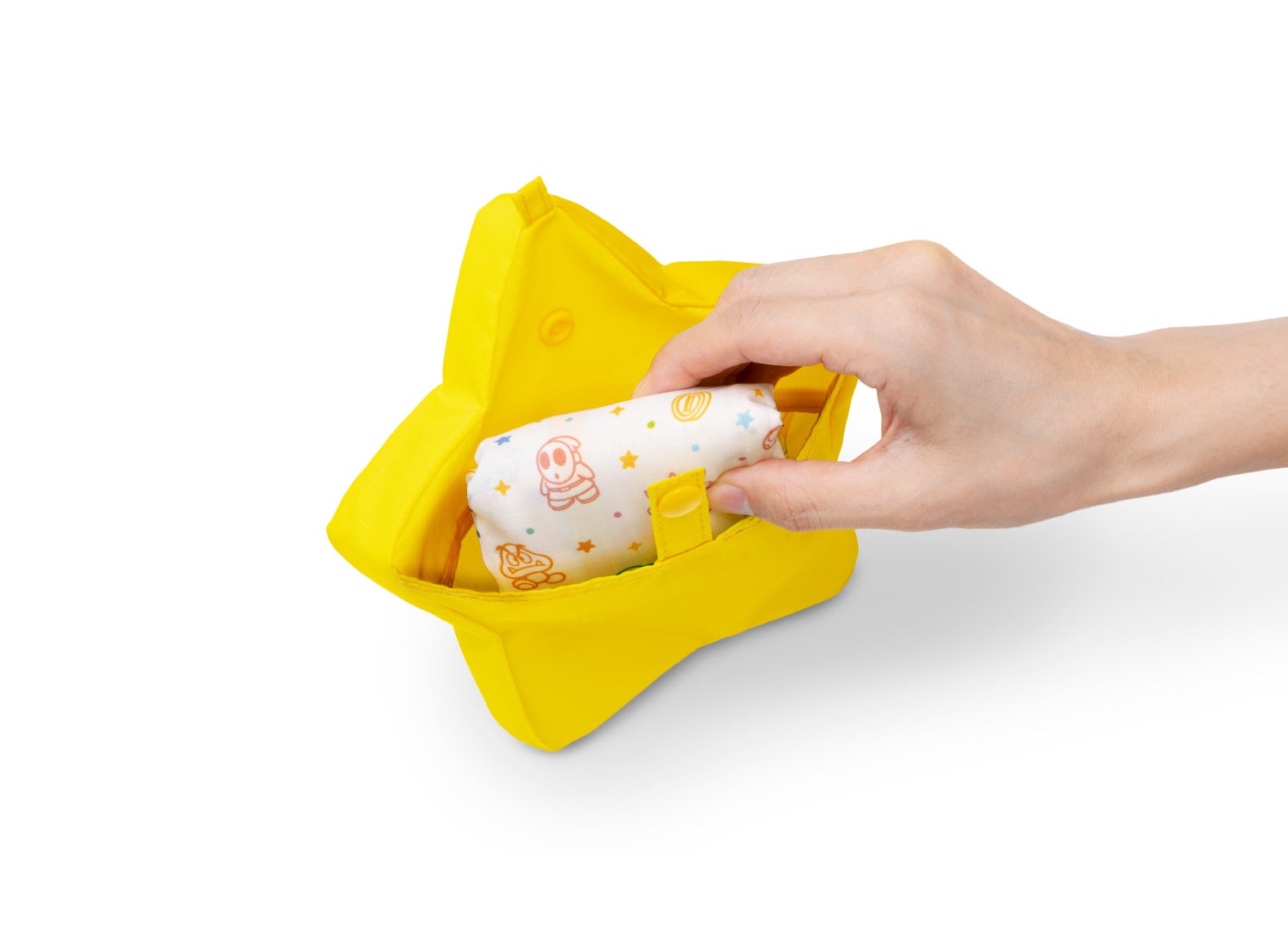 エコバッグとして使用する際は、マスコットに収納してコンパクトに持ち運ぶことができます。(マスコットはバッグと一体型です。)