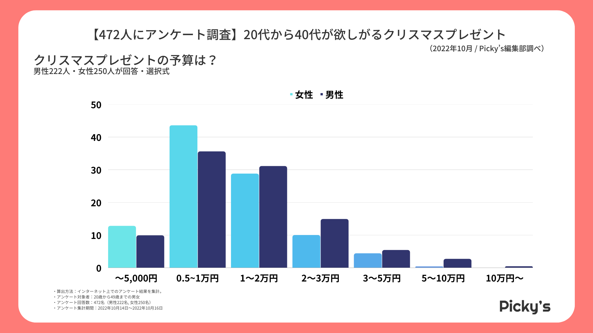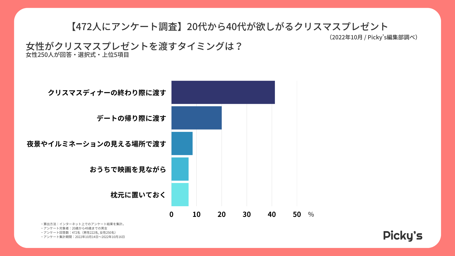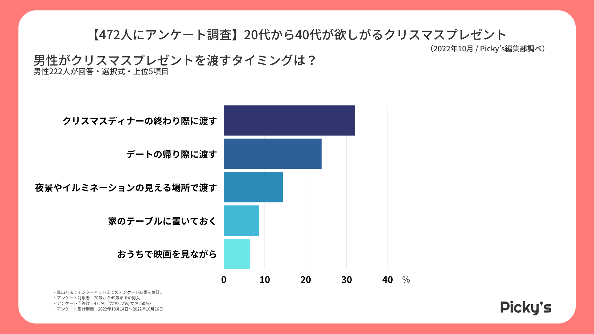 このたびPicky’s(https://rentry.jp/note/)では、クリスマスプレゼントに関してもらったら嬉しいプレゼントやクリスマスプレゼントを渡すタイミング等についてインターネット上でアンケート調査を行い、ランキングを作成いたしましたので発表いたします。