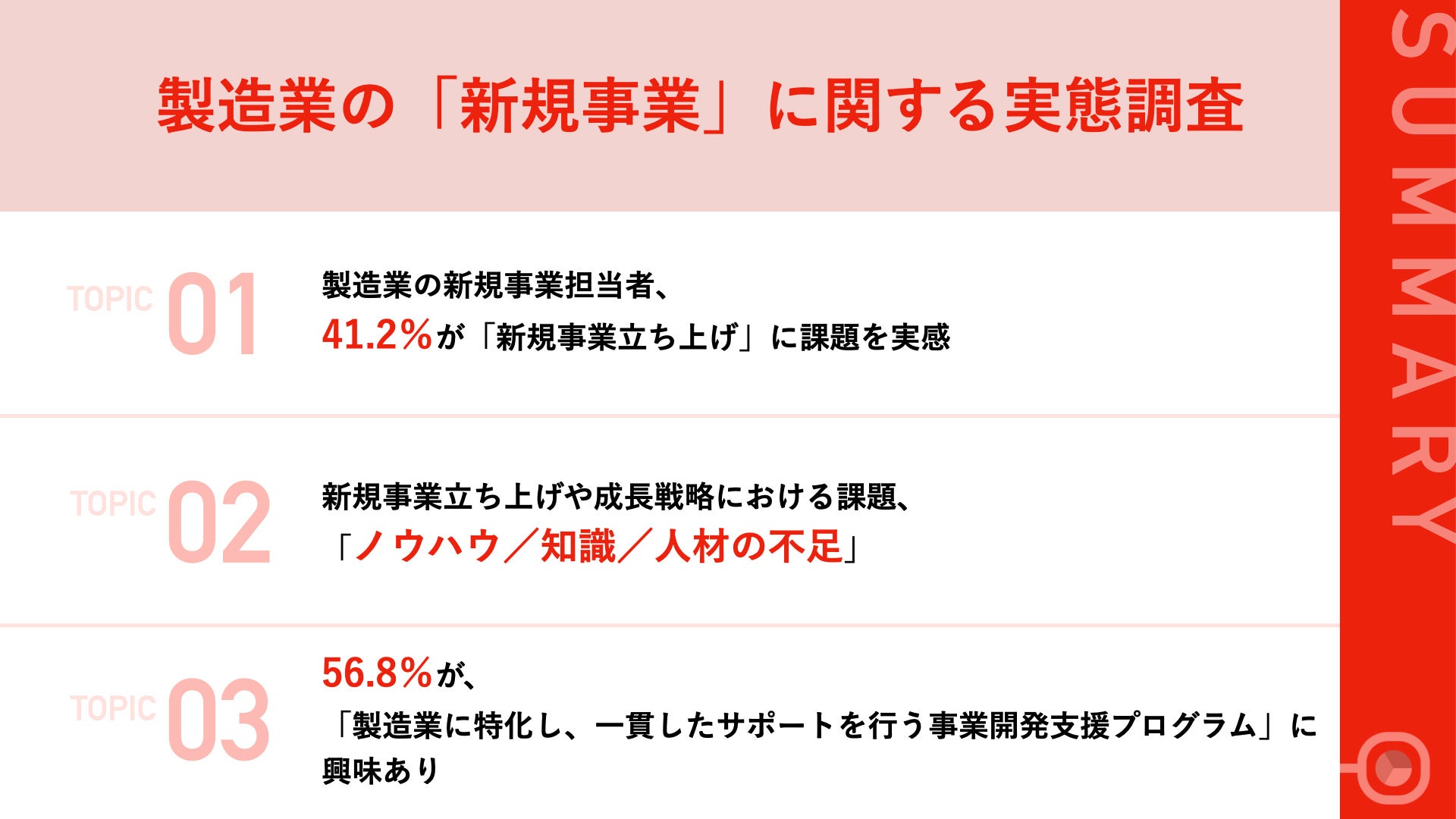 今回の調査では、製造業が新規事業に参入する際、ノウハウや知識、人材不足が課題となっており、その課題を解決するべく活用した新規事業支援サービスにおいても、悩みや不満を抱えていることが分かりました。製造業に特化し、顧客の特定から市場の投入まで、一貫した新規事業開発プログラムには、半数以上が興味を示していることからも分かるように、限界のある社内リソースだけに頼るのではなく、専門プログラムの活用を積極的に検討することが新規事業の成功の鍵と言えるのではないでしょうか。