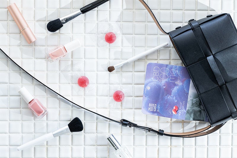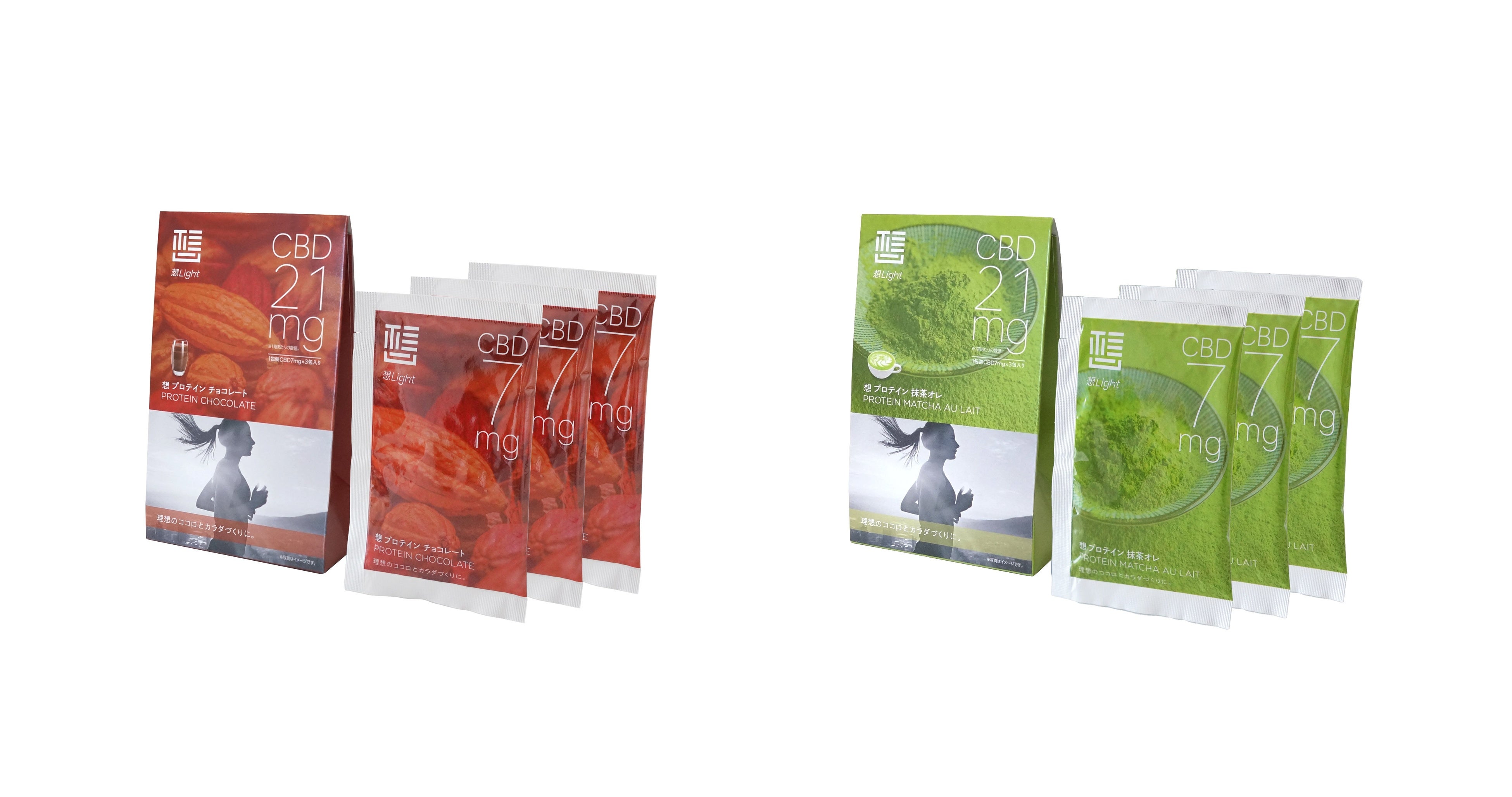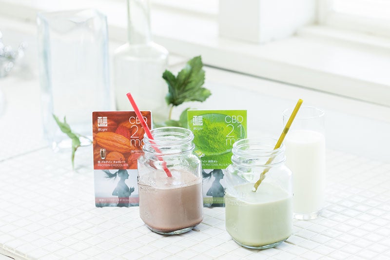 CBDを配合したオイル、CBDを配合したグミ、CBDを配合したインスタントコーヒー、CBDを配合した抹茶オレ味のプロテインと、チョコレート味のプロテインを、