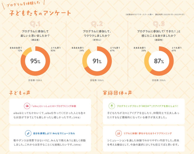 2022年度のプログラムの調査結果(2022年度7月~2023年1月実施)では、参加した子どもや学童担当者からの満足度が高く、子どもの創造性や好奇心の向上に寄与しているという成果が認められました。