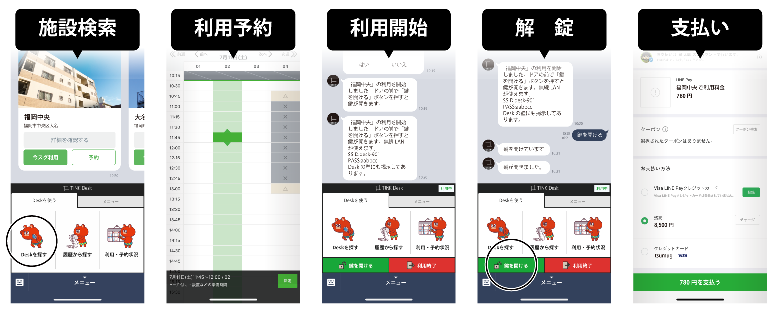 昨今のさまざまな働く環境に対応する、オフィス・自宅に続く3つ目の新しいワークスペースとして展開する空間サービスです。これまで「TiNK Desk」は、福岡市内や東京都内など累計13拠点にサービスを提供してきました。LINEで「友だち登録」するだけで利用可能で、新たなアプリをダウンロードする必要はありません。 LINEで「友だち登録」後は15分単位で利用/予約が可能で、施設の検索、予約、解錠、決済までLINEのトーク画面から行えます。