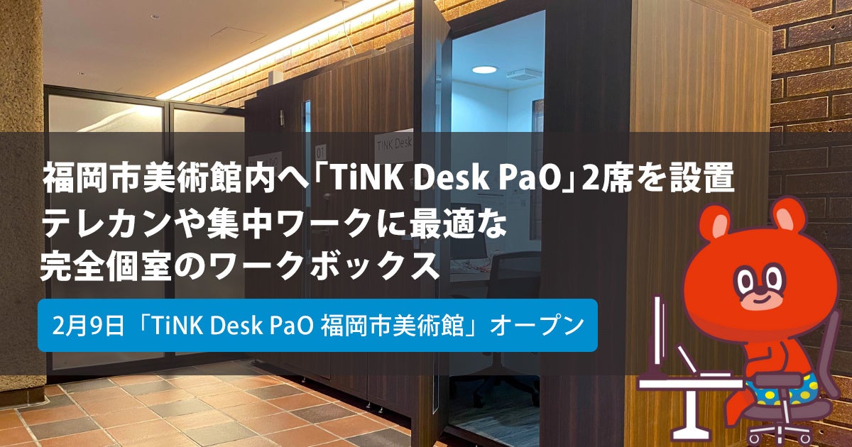 空室利活用サービスを開発する株式会社tsumug(ツムグ)は、2月9日に福岡市美術館内へシェアワークスペース「TiNK Desk PaO」をオープンします。福岡市および公益財団法人福岡観光コンベンションビューローと連携し、テレカンや集中ワークに最適な完全個室のワークボックス2席を設置。福岡市中心部のオアシスである大濠公園そばのロケーションでのワーケーションも実現します。