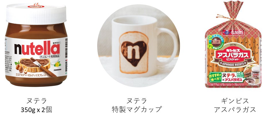 公式アカウントをフォローし「あなたがつくったヌテラのオリジナル朝食レシピ」の写真を投稿していただいた方の中から抽選で100名様に「ヌテラ 350g×2個」と「ヌテラ特製マグカップ」、「ギンビス アスパラガス」をプレゼント!