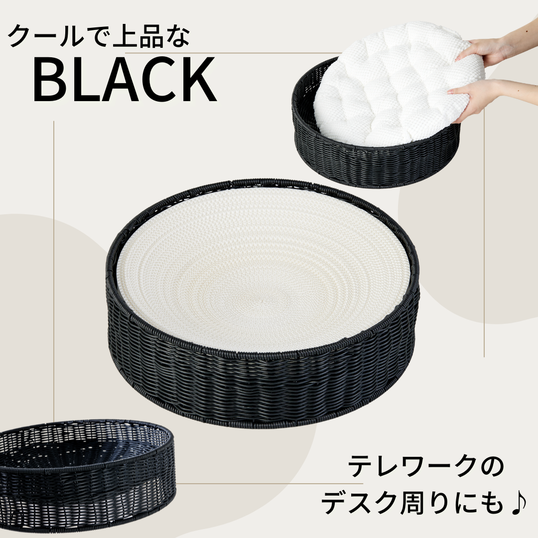 猫ちゃんが大好きな編み込みの人工ラタンを採用しているため、爪とぎリフィルやクッションを設置する前に、本体に寝転んでしまう猫ちゃんも続出♪通気性も良く水洗いもできるため、湿度や気温が高い夏場でも、ダニの発生なども気にせず、衛生的に長くお使いいただけます。
