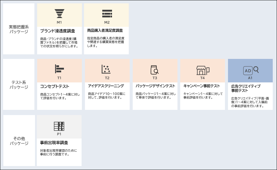 「ニーヨン」ではこれまで、ブランド評価やコンセプト評価など、商品の企画・検討段階での調査を中心に6種のパッケージを提供してまいりました。今回、新たに2種類のパッケージを追加することにより、マーケティング施策の企画から実施まで幅広い課題に対応可能となります。